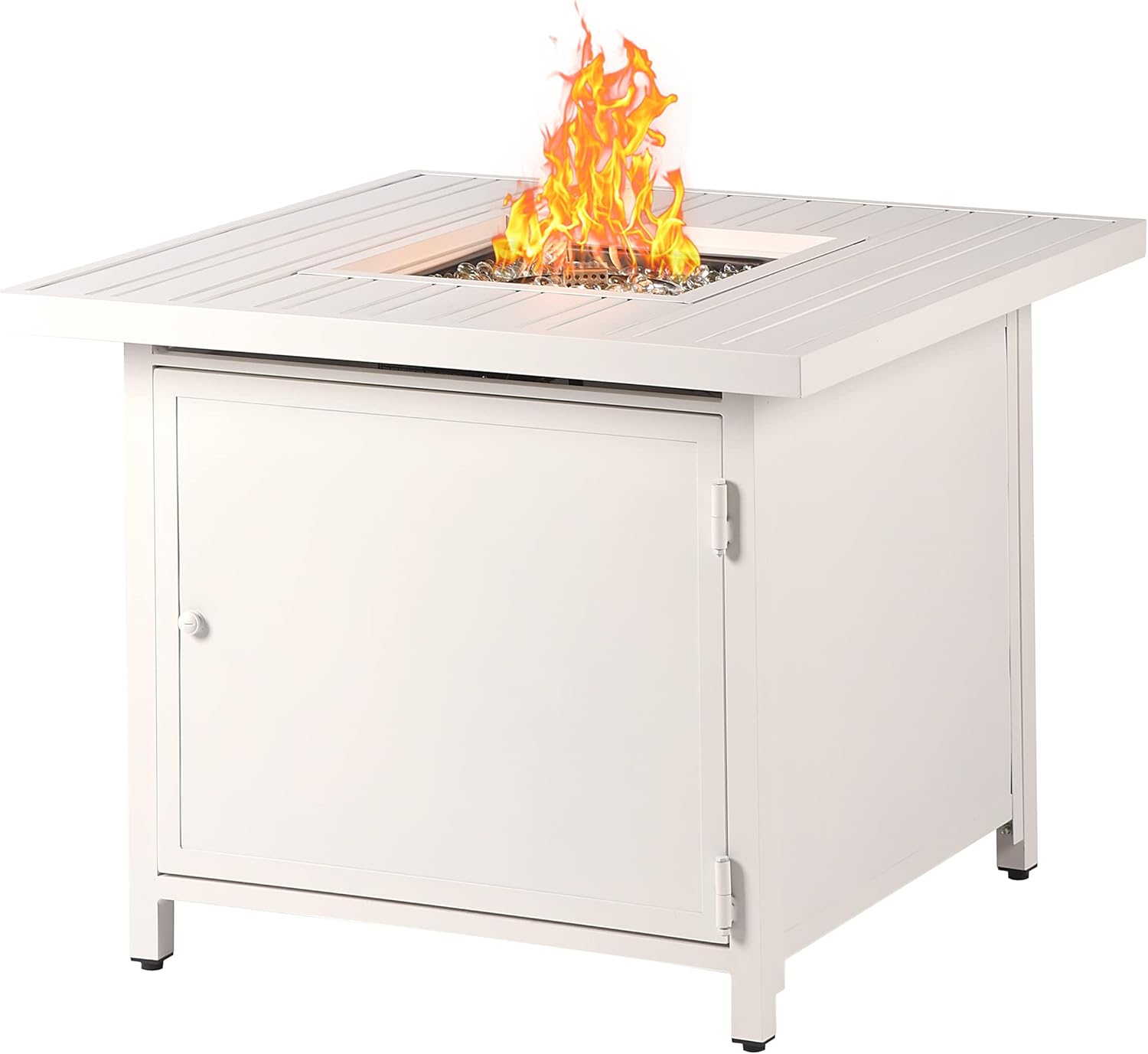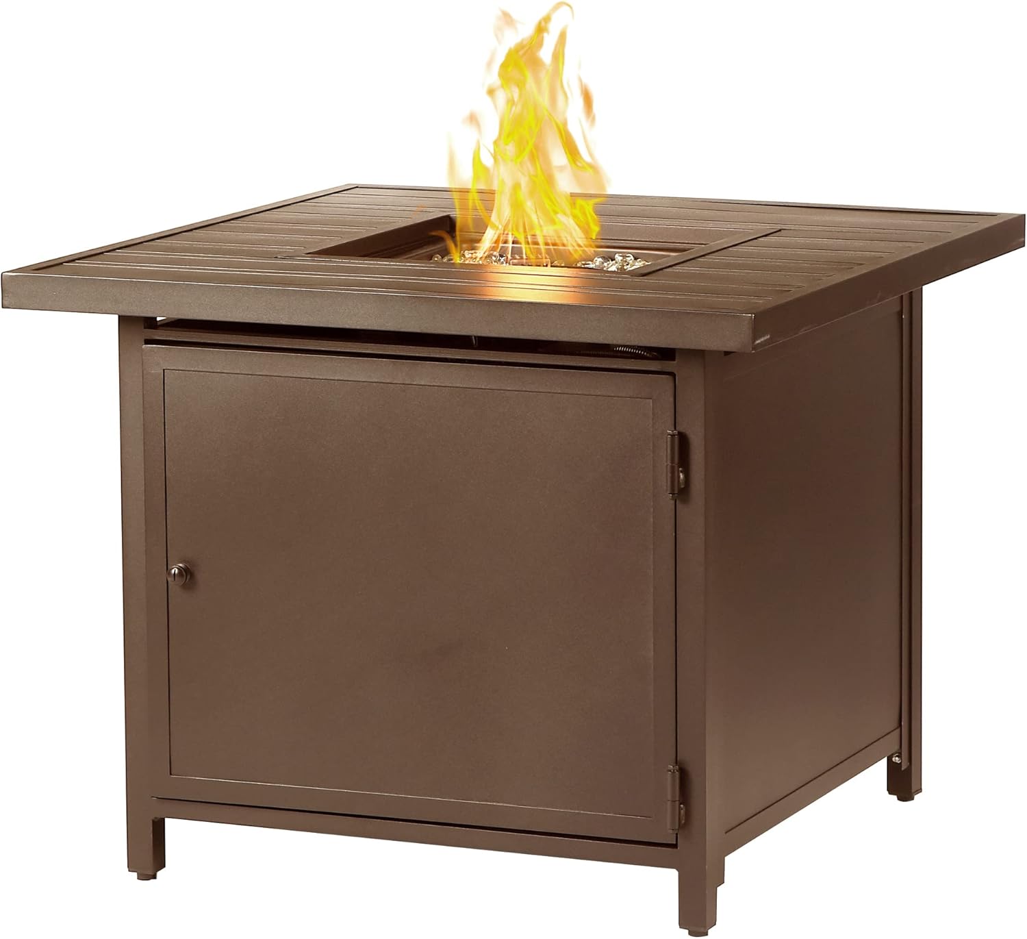 Bring the warmth and ambiance of this Square 32 in. x 32 in. Aluminum Propane Fire Pit Table with Glass Beads, Two Covers, Lid, 37,000 BTUs in Blue Finish to your patio, deck or backyard. Featuring a stylish clean durable powder coated finish, this fire pit is complete with a durable rust-free solid aluminum design base, making it an attractive centerpiece for your outdoor living space. Complete with a 37,000 BTU stainless steel burner and integrated ignition, you can enjoy all the ambiance of a classic fire without the mess or danger of tending ashes. All of the complicated electrical and gas control components are preassembled unlike other fire tables. This fire pit comes with clear fire glass, a table lid, propane tank cover and a protective table fabric cover. The dimensions for the propane fire pit table are: 32" L x 32" W x 24.5" H, 55 lbs.