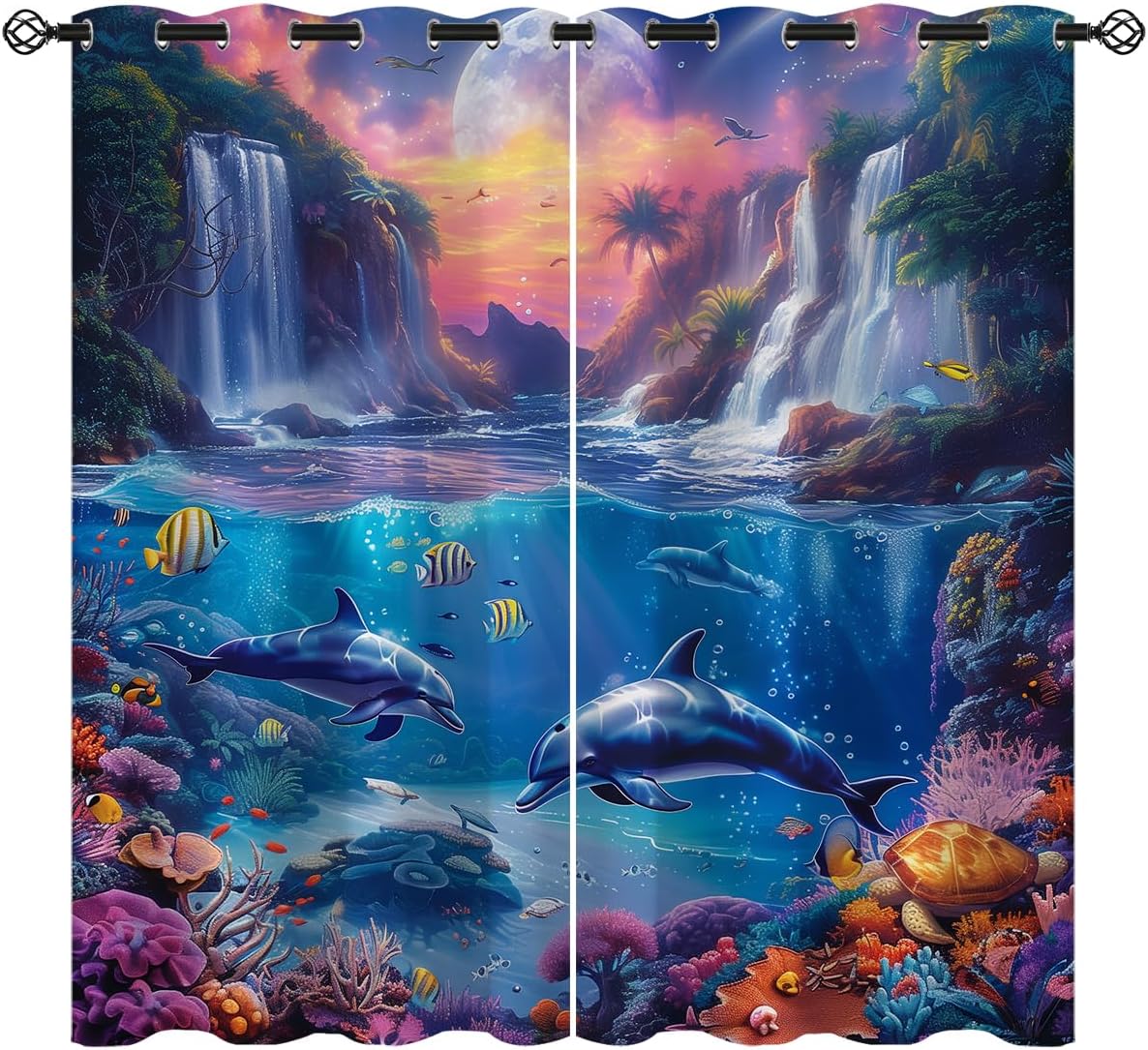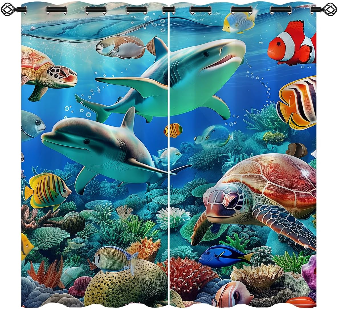 These print curtains are perfect for Living room, bedroom, kids room, kitchen, yard, patio, parlor, sliding door with Ocean Underwater World,Colorful Fish Octopus Pirate pattern.- Unique design:· Save energy costs by insulating against heat and cold.· Reduce noises from busy streets and high-traffic areas.· Protect furniture from sun damage and fading.· Provides complete privacy when needed· Perfect for any bedroom, office kids room and living room.- Package Included:· Blackout window curtains 2 Pcs set ( two panels).- Material:· Our Blackout Curtain Liners are crafted from a durable soft and thick triple weaved blackout fabric which can block out sunlight and UV rays. The darker color of the fabric, the more light it can block.- Easy Care Instructions:· Machine washable in cold water· Do not bleach.· tumble dry on low· low temperature ironing- Notes:· For your curtains to be more perfect, please choose a size 5-10 Inch larger than the actual window width.· here may be slight differences in colors on different displays. If you have any questions about the product, please feel free to contact us.