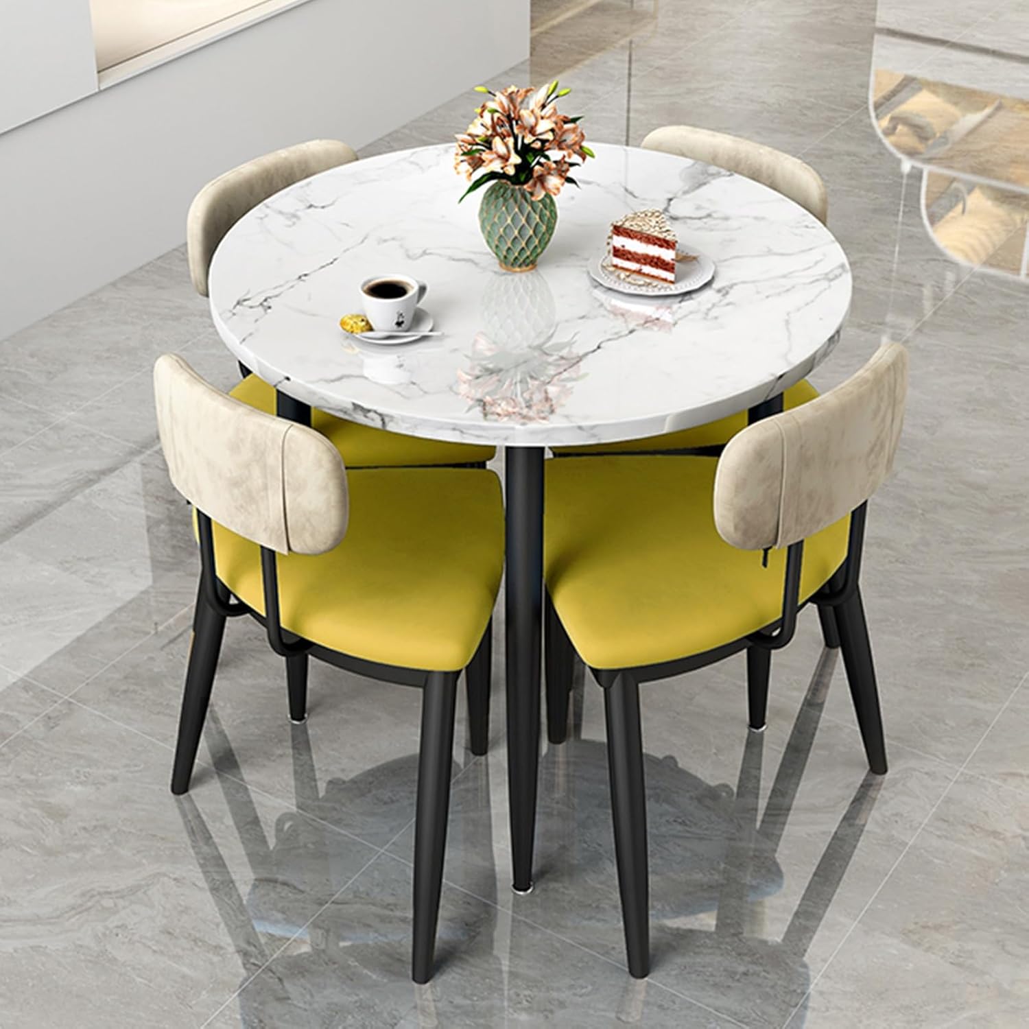 Product Description Our charming modern set enhances the appearance of any dining area with its stylish design and decoration. The safe rounded corners of the business dining table set can effectively avoid accidental scratches and ensure safe use. Anti-slip pads are added to the bottom of each table and chair foot to protect the floor from damage. The table and chair set can be stored, occupying a small area and saving space Product Parameters: Product Name: Table and chair combination Color: Gray , Orange , Blue , Yellow Features: Simple, generous, space saving Style: Simple and modern Bracket structure Material: Iron Table shape: Round Desk top material: Wood-based panel Table top diameter: 80 cm/31.4 inches Chairs material: Fabric Total chair height: 73cm/29in Applicable scenes: office, coffee shop, tea shop, reception, restaurant, library, cinema, clothing store, maternal and child shop, living room, etc. Applicable number: 4 people Packing method: assembly Packing list:1*table, 4*chairs (other things are decorations, not included) Warm Tips: 1. Size Description: The product is completely measured by hand and may have an error of 1-3 cm. Please refer to the actual items received. 2. Picture description: The product is real. Due to problems with light, angle, display, etc., there may be slight chromatic aberration, please forgive me.