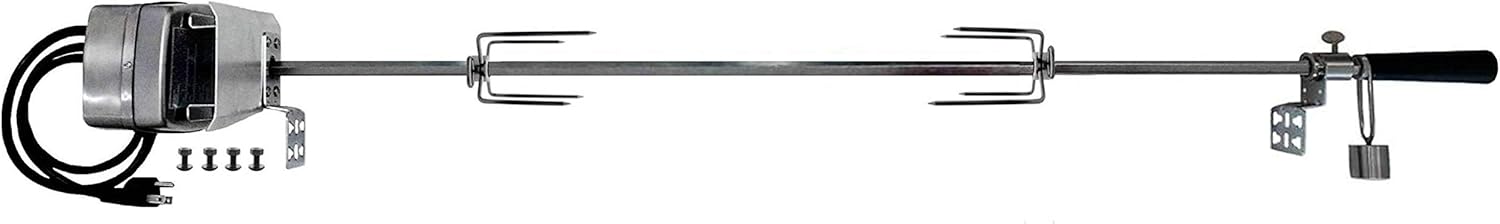 The OneGrill 45'' X 1/2" Heavy Duty Chrome Steel Rotisserie Kit is made for the grill enthusiast who wants to add power and durability to their rotisserie application. The OneGrill 50 lb. Heavy Duty Motor features a stainless steel weather resistant housing, an anti-backlash gear train for smooth operation of unbalanced loads, and quiet operation through a unique internal gear reduction. The heavy duty spit, forks, brackets, and counter balance system are all constructed of high quality chrome steel for easy cleanup and extended life. *Designed to fit grills up to 39" wide across the grill head. Featuring the OneGrill top rated Stainless steel electric Motor, this kit will turn loads up to a maximum of 50 lbs. perfectly balanced and evenly distributed. Please note for naturally imbalanced animals such as pig or lamb a 30 lb. weight limit is an achievable maximum expectation and additional counterbalancing may be required. *Universal style fitment to MOST grills. Please review all Technical Specification Documents, descriptions, and images to ensure fitment to your specific application prior to purchase. This kit is backed by the OneGrill 1 year "No Hassle Warranty". THIS COMPLETE SET INCLUDES:(1) OneGrill Stainless Steel Rotisserie Motor; 110v, (1) 45" X 1/2" Hexagon Profile Chrome Steel Spit Rod, (2) Premium Four Prong Chrome Steel Spit Forks, (1) Chrome Steel Universal Bracket Set, (1) Premium Contoured Handle, (1) 8 oz. Chrome Steel Counter Balance Weight, (1) Chrome Steel Locking Washer, (1) Chrome Steel Spit Rod Bushing.ONEGRILL ADDITIONAL ACCESSORIES AVAILABLE EXTRA SPIT FORK PAIR (model 4pf04):B00CERGWTU PERFORMER UNIVERSAL BASKET(model 5pb815): B01NAEOFXK STAINLESS FLAT ROTISSERIE BASKET(model 4pb20):B008P4B8M2 STAINLESS TUMBLE BASKET(model 4pb21):B008P4UM3I NEED EVEN MORE WEIGHT CAPACITY? SEE: B00N36OULS HAVE A WEBER GAS GRILL? SEE: B008RS6UOC, B00VXPYFQG,B078Y9K61N & B071LJ7LHR