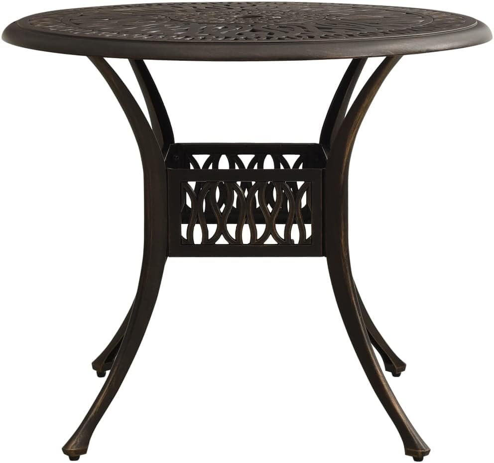 Enjoy a lovely afternoon tea or a cup of coffee in your outdoors on this patio table with your family and friends!This tea table is made of cast aluminium, making it stable, sturdy and ideal for daily outdoor use. The tabletop features a unique hollow design and is suitable for placing drinks, food and other essentials. The four separate legs bring you a reliable user experience for its stability. Additionally, this patio table has an umbrella hole that can perfectly accommodate your umbrella to protect you from sun or rain.Color: WhiteMaterial: Cast aluminumDimensions: 35.4" x 29.1" (Diameter x H)Assembly required: Yes