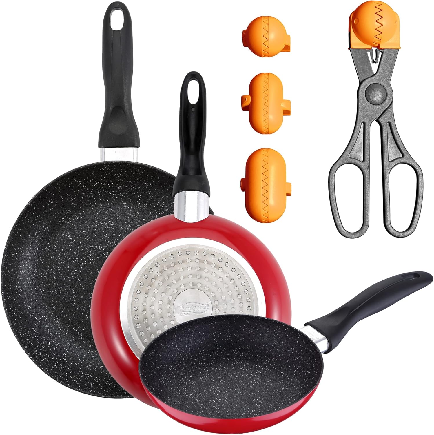 Set of 3 frying pans + multi-purpose utensil La Croquetera. The pan set is made of pressed aluminium with marble coating. Red exterior and mottled black interior. Bakelite handle in black. Includes 1 piece: Ø16 x 3.2 cm. 1 piece: Ø20 x 3.5 cm. 1 piece: Ø24 x 3.8 cm. The multi-purpose tool is perfect for forming kibbles, meatballs, potato balls, fritters, sushi... quickly and easily. Easy to use, comfortable and lightweight. Includes 4 interchangeable moulds (2 round and 2 rectangle) and 20 storage trays for freezing, with a total capacity of 200 doughs. The fittings have air outlet holes to promote non-adhesion of the dough. They are dishwasher safe. Colour: blue.