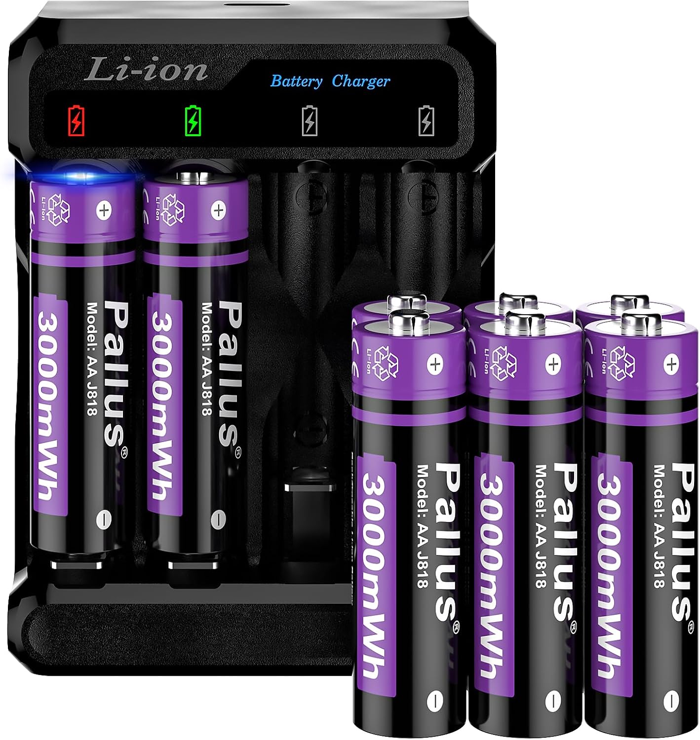 The Pallus 3rd Rechargeable Lithium AA Batteries, designed to provide reliable and long-lasting power for your everyday devices. With an impressive 3000mWh capacity, these batteries offer extended usage time, ensuring you can stay powered up for longer. Recharge them conveniently using Pallus AA battery charger, eliminating the need for constant battery replacements and reducing waste. Compact and lightweight, these batteries are perfect for remote controls, toys, cameras, and other gadgets that require AA batteries. AA Batteries Dimensions: 1.97 x 0.57 inches (50 x 14.5 mm). Weight: 0.71 oz (20.1g) per battery. A new generation lithium AA rechargeable batteries is here. Equipped with short-circuit protection, overcharge protection, constant voltage control circuit, etc. - the Pallus laboratory has once again defined the smart chip technology in the battery field. Q039 Ultra Charger When the batteries are charging, the lights on the charger shine red. The + terminal on the batteries have blue LED lights in them that flash when they are being charged. When fully charged, the charger beeps 3 times. It beeps each time one of the batteries gets fully charged, so when charging 4 batteries, it will beep a total of 12 times. Some Tips : You can use these rechargeable aa lithium batteries on VR gamingpad, XBox one S/X controller, Xbox Series S/X contorller, Toys, Remote Controls, Smart home devices, Microphone, Electric shaver, blink camera,Household Office Devices, Flashlight(The charging current of the flashlight is less than 3A to be used). NOTE: This battery is a new generation 1.5v lithium rechargeable aa battery, so the traditional universal charger (for NiMH & 3V-3.7V Li-ion batteries) does not work for this battery. Tips:If you buy for blink camera,please donot use on blink 4 gen ! Questions & Answers Question: Will these work with blink cameras? please answer if you know for sure, don't guess. thanks! Answer: It is just like a regular AA battery, so YES, it will work with your camera. After test,is fits for blink 1/2/3 gen camera,but donot for 4 gen. The characteristics of these types of batteries are higher capacity (means they last longer per charge) ,and no memory effect (means that you can charge them whenever you want), but they usually can't handle high drain equipment such as the big camera flash.(In short:the max discharge current of this battery is 3A,if your device discharge current is less than 3A,you can use directly. Question: Why do I feel my flashlight torch last longer in Alkaline aa battery,even while this aa rechargeable batteries keeps more bright? Answer: Usually alkaline batteries have a slightly higher capacity than rechargeable batteries, which allows your flashlight to work longer.However,the output volt of alkaline batteries will gradually decrease ... this may makes alkaline batteries seem to last a long time, but you will find your torch will get dimmer and dimmer....this is unacceptable!!! In contrast, rechargeable battery will not be so,especially this battery has constant voltage output, it will keep your flashlight in a high brightness for a long time,plus this is rechargeable and reusable, overall more cost-effective, personally, I would highly recommend this rechargeable aa battery... What You Get: 12 pack pallus 1.5v rechargeable aa lithium batteriesPallus AA / AAA battery charger(Not include adapter)USB-C charging cableBattery storage box Our worry-free 12-month warranty, and friendly customer service!
