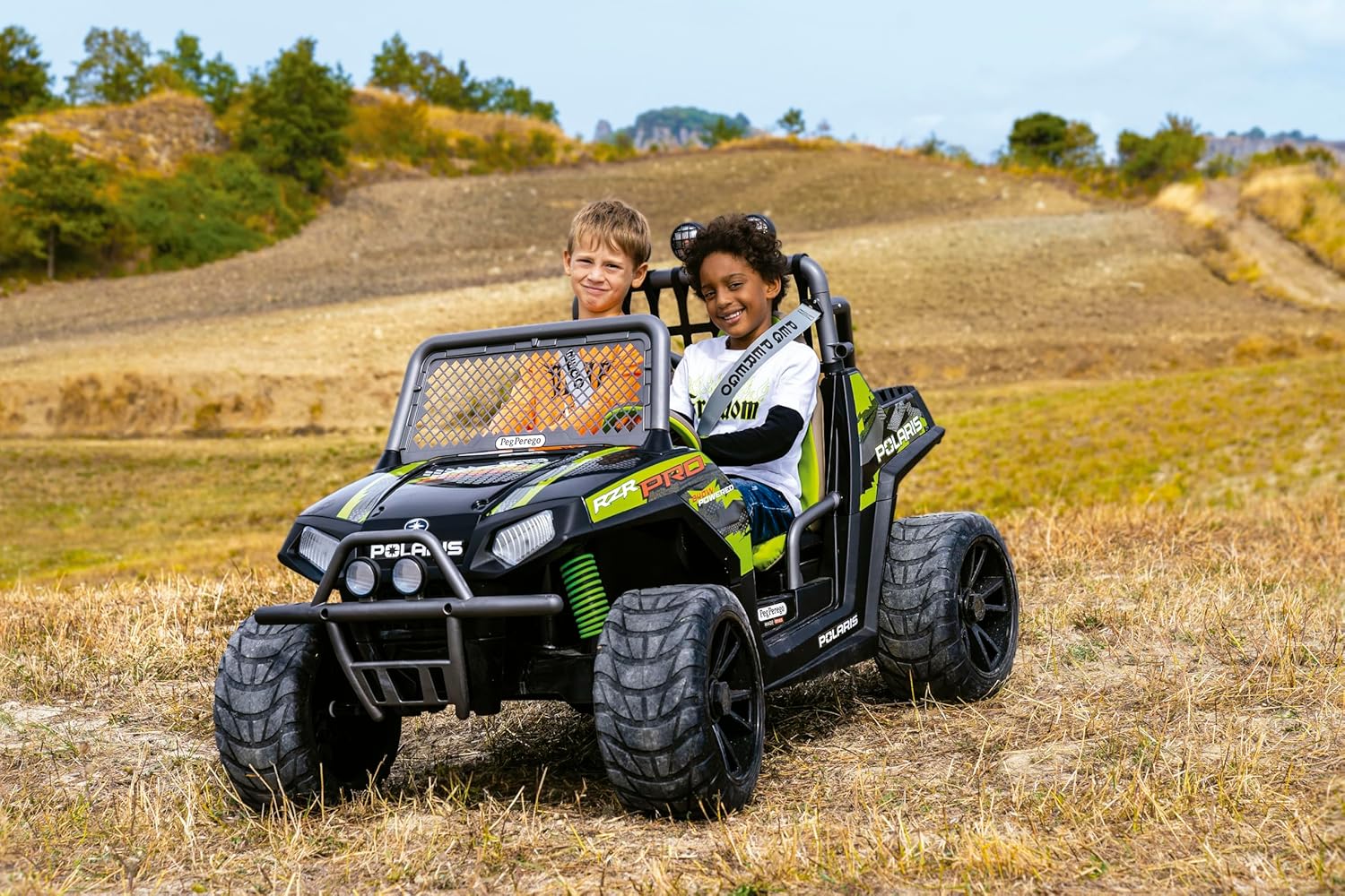 Perfect for exploring and taking on the world, with the Polaris RZR PRO Green Shadow, fun and excitement is always there to be had. This 24 volt super power allows kids to drive all over at speeds up to 7.5 mph. Seat belts, working rear suspension and an FM radio with MP3 input create a realistic riding experience for this all-terrain vehicle. The large extreme traction rubber wheels, designed to perform like real ATV tires, allowing them to conquer different riding surfaces. 24-volt rechargeable battery and recharger included. Made in Italy.