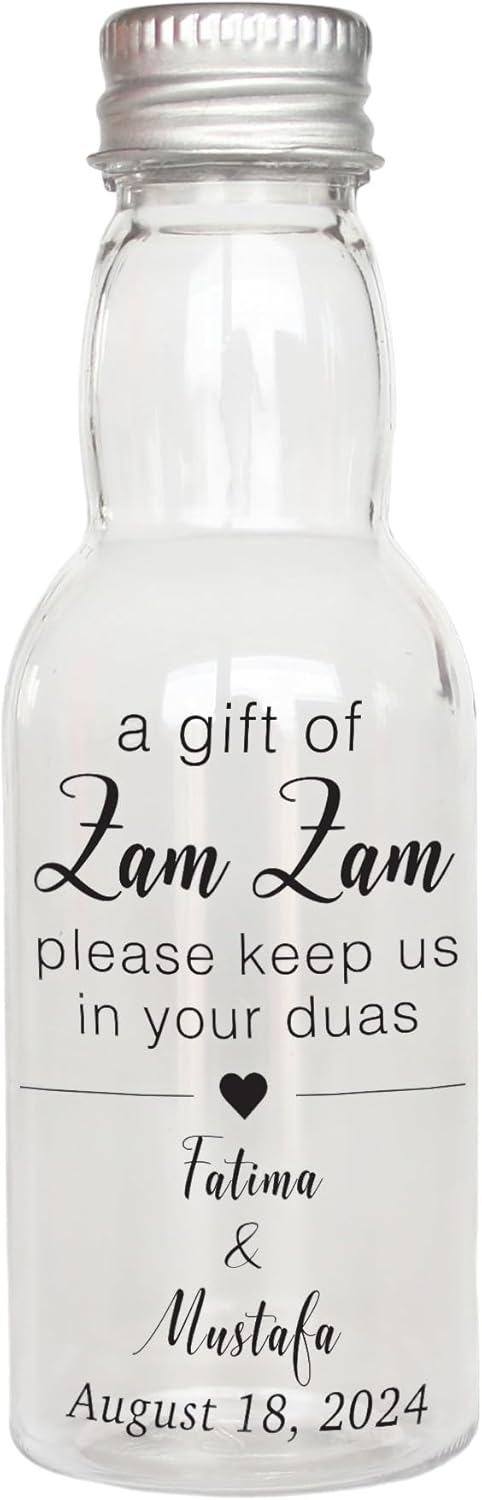 Share the Blessings of Your Special Day with Elegant Personalized Favors Make your Islamic wedding, Nikkah ceremony, or Hajj homecoming truly unforgettable with our Customized Mini Plastic Favor Bottles. Designed specifically for sharing precious liquids like Zem Zem water, these bottles serve as a cherished memento for your guests, reminding them of your special occasion for years to come. A Personal Touch for Every Guest Forget generic gifts. With over 10+ unique label designs and customizable text, each bottle is tailored to your event. Whether you want to display the couple's names for a wedding or a welcoming message for a pilgrim, our high-quality stickers add a premium touch. Choose from Gold, Silver, Black, Green, or Cork caps to perfectly match your event's color theme. Safe, Durable, and Perfectly Sized Unlike fragile glass bottles that can break during transit or in your guests' pockets, our bottles are made from high-quality, durable plastic. They offer the clarity of glass without the risk. With a 40cc (approx. 1.35 oz) capacity. Versatile for All Occasions These empty bottles are the ideal choice for: Islamic Weddings & Nikkah: A spiritually meaningful favor. Hajj & Umrah Gifts: Share the blessed water from Makkah with friends and family. Aqiqah & Ameen Ceremonies: Celebrate your child’s milestones. Baby Showers: A unique and thoughtful giveaway. Note: Bottles are sold EMPTY. Liquid is not included.