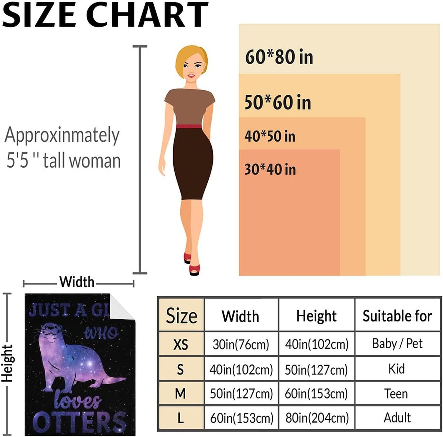 Product Name: Otter BlanketsMaterial: FlannelAvailable Sizes:30" x 40" (72 x 102 cm) - Lap Size: Compact and lightweight Lap Size, perfect for draping over your lap to provide extra warmth and comfort.40" x 50" (102 x 127 cm) - Crib Size: Crib Size, offering a cozy cover for your baby's crib, ensuring warmth and security.50" x 60" (127 x 153 cm) - Throw Size: The Throw Size, large and cozy, easily thrown over a couch or bed, providing extra comfort for you and your family.60" x 80" (153 x 204 cm) - Twin Size: Twin Size, large enough to cover a twin bed, keeping you and your partner warm and snug on chilly nights.Experience the ultimate comfort and warmth with our otter Blankets, crafted from high-quality flannel material. These blankets are suitable for the entire family, from babies and kids to adults.Key Features:Premium Flannel Material: Our blankets are made from high-quality flannel material that offers not only softness and comfort but also warmth and lightweight convenience.Delicate Feel: These blankets have a delicate texture, making them ideal for your baby's sensitive skin. They are also light and breathable, ensuring a comfortable night's sleep.Durable and Easy to Maintain: Bid farewell to issues like lint, pilling, and wrinkles. Our blankets are designed to be anti-pilling, anti-wrinkle, and resistant to shedding. Plus, they are machine washable for effortless cleaning (please avoid using bleach).Skin-Friendly: Our blankets are gentle on your skin and safe for your kids and pets, ensuring a peaceful and comfortable night's sleep.Versatile Use: These lightweight and warm blankets are suitable for year-round use. Whether you're cuddling up in bed, relaxing on the sofa, working in the office, camping, watching a movie, or traveling, our otter Blankets provide the perfect companionship.