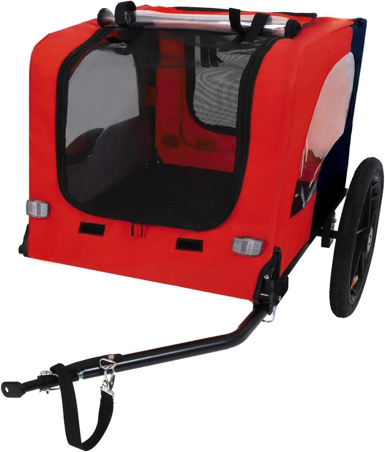 Material: SteelColor: RedWeight Limit: 66 lbsPackage Includes: Internal Leash, Safety Flag, Reflective Lights, Universal CouplerMounting Type: Quick-Release WheelNotes: Do not over-inflate tires; compatible with most adult bicyclesCountry of Origin: ChinaCompatible Models: Adult bicyclesDimensions: N/ACapacity: 1 petAdventure Awaits with Your Pet! This weather-resistant bike trailer offers a stable and secure ride for your furry companion. The foldable steel frame ensures compact storage, while the non-slip floor and adjustable internal leash keep pets during cycling. The 2-in-1 canopy and mesh shield provide from insects and light rain, and the reflective lights enhance visibility during dawn or dusk rides. for outdoor adventures, this trailer is ideal for family-friendly trips to the park, trails, or shopping destinations. Key Features: Quick-release wheels, universal coupler, ventilation, and easy-to-fold design make it a versatile companion for pet owners. and Comfortable: The rear doggy door allows easy access, while the safety flag ensures visibility to other cyclists. For: Small to medium pets up to 66 lbs, including beagles, border collies, and bull terriers. Enjoy the Ride: Transform your bike into a pet-friendly vehicle with this family-friendly trailer designed for outdoor