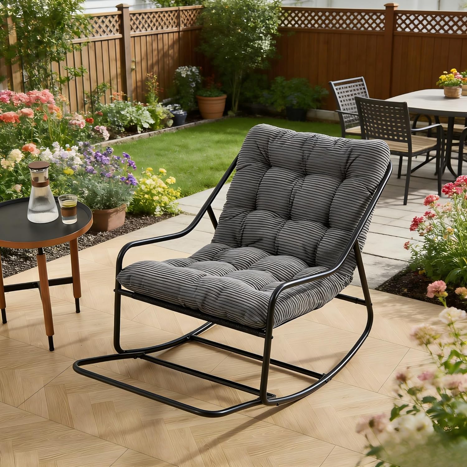 Experience ultimate comfort and relaxation with our metal rocking chair outdoor with footrest. Designed with a high-density, ultra-thick cushion, this chair offers the perfect balance of softness and support, making it ideal for lounging, reading, or enjoying the outdoors. The patio rocking chair features an adjustable rocking motion, allowing you to customize the swing to your preference, whether you’re looking for a gentle sway or a more pronounced movement. Its sturdy, durable metal frame supports up to 300 lbs, ensuring it lasts for years of enjoyment, both indoors and outdoors. The outdoor rocker chair combines sleek modern design with functionality, making it a stylish addition to any patio, porch, or garden, while providing a comfortable ottoman for added relaxation. Plus, with quick & easy assembly, you’ll have your new favorite chair set up in no time, making it the perfect solution for any space, from your living room to your backyard.