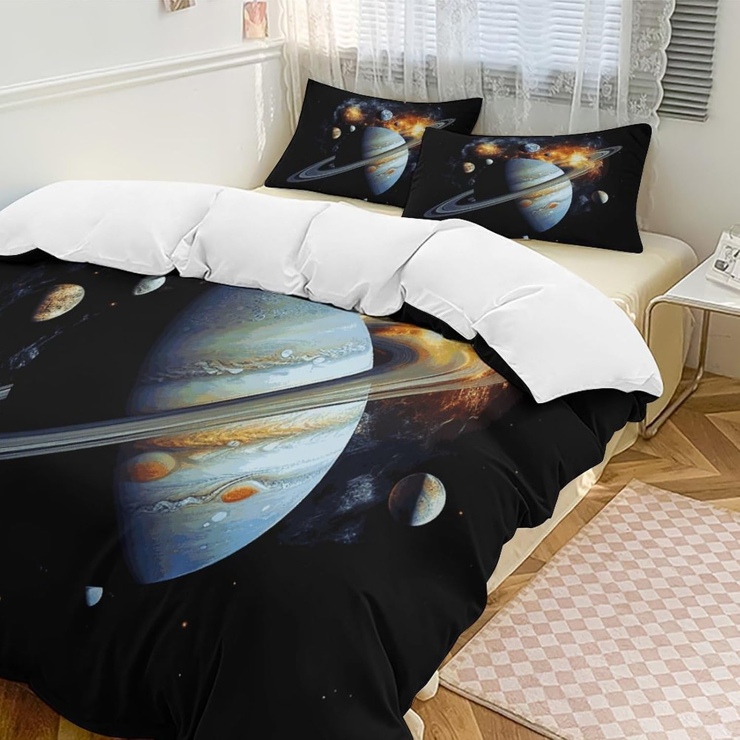 Duvet Cover Set, Cotton Comforter Cover with Pattern Duvet Cover Set,Soft Bedding Set Includes with 3 Piece (2 Pillow Shams,1 Duvet Cover)Package include: 3-Piece Bedding Set (1 Duvet Cover + 2 Pillow Shams)Planet Jupiter bedding set that can simply decorate your room at any time and give you a fresh feeling, suitable for all year roundDurable.This sheet set is made of polyester microfiber for long-lasting strength, natural shrinkage resistance, and a noticeably soft feel.Size Information: :Size (3 duvet covers). 1 duvet cover 86" x 70"(218 x 177cm), 2pillowcase 20" x 30"(50x70cm).WITHOUT COMFORTER.SIZE (3-piece comforter set). 1 comforter set 79" x 90"(200 x 229cm), 2 pillowcases 20" x 30"(50 x 70cm).WITHOUT COMFORTER.SIZE (3-piece comforter set). 1 comforter set 90" x 90"(229 x 229cm), 2 pillowcases 20" x 30"(50x 70cm).WITHOUT COMFORTER.SIZE (3-piece set). 1 duvet cover 102" x 90"(259 x 229cm), 2 pillowcases 20" x 30"(50 x 70cm).WITHOUT COMFORTER.Personalize your bedroom.Beautiful designs and colorful prints make your bedroom unique and bring you a wonderful dream.Washing instructionsMachine wash separately in cold water, hang dry, do not bleach.Occasion.This lovely soft duvet cover set is designed for adults, men, women. This duvet cover set is also suitable for the whole season, spring, summer, autumn and winter. It can also be used as a gift for your family and friends.