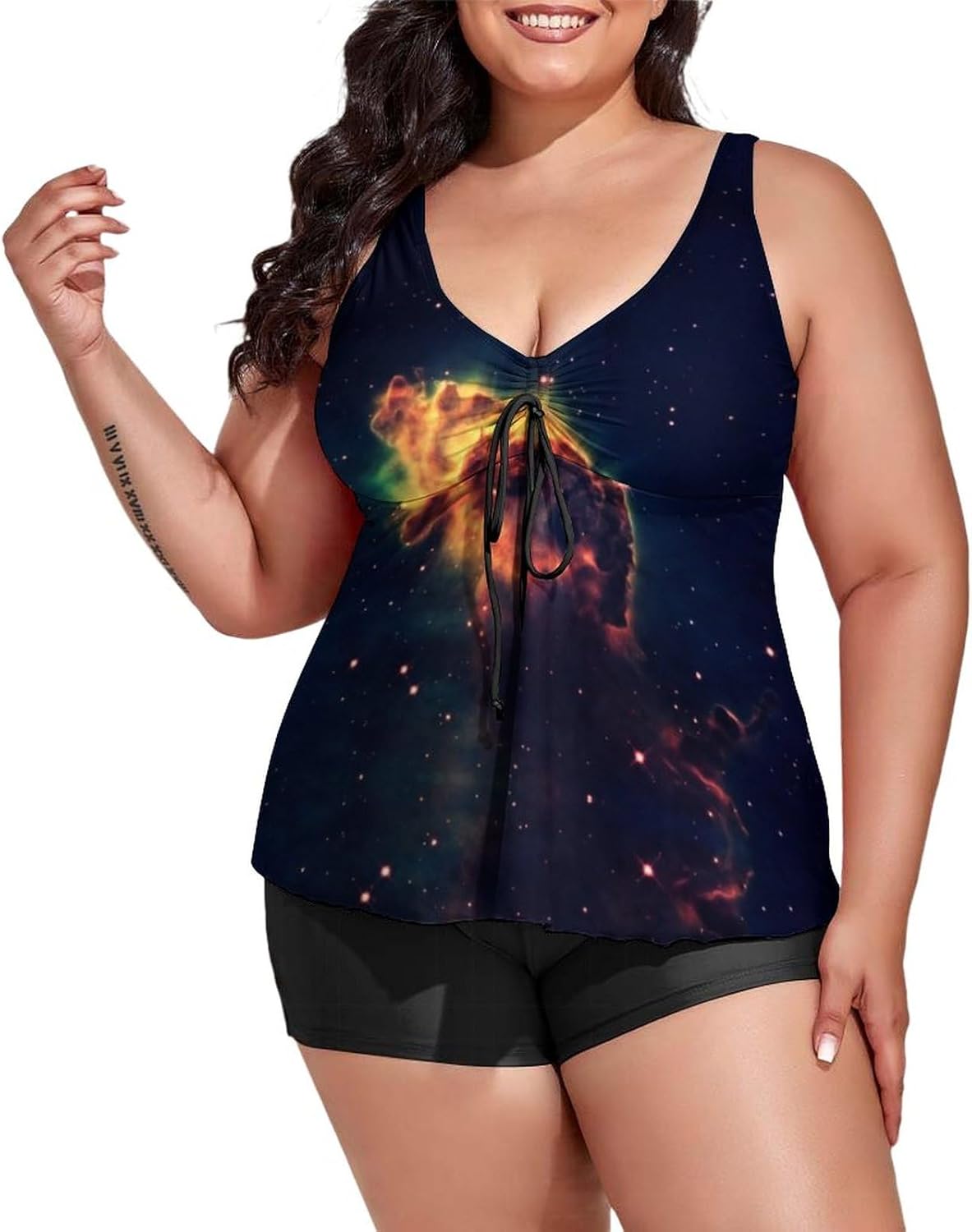 Womens 2 Piece Galaxy Universe Nebula Retro Galaxy Tribal with Top/BoyshortsOuter Space Star Nebula Astral Cluster Astronomy Theme Galaxy Mystery Two Piece Plus Size Tankini Swimsuit for WomenCoverageThe design of this suit provides good coverage,it covers up everything what you want it to hide.Comfortable Plus Size Tankini Swimsuit for WomenOuter Space Infinity Galaxy Swimsuits are made of high quality material and brings you comfortable and soft feelings. Wear it, inspire Confidence and Beauty.Women Plus Size Tankini Swimsuit with Shorts Tummy Control 2 piece Bathing Suits Top Swimwear.Cute bowknot makes you charming. Just wear this swimwear and show your glamour.Soft boyshorts make you feel more comfortable for swimming, beach party, vacation and running.Floral print plus size swimwear is suitable for all ages.The swim tops have tie knot, you can adjust the bow to give you a personally fit. This two piece swimwear is perfect for parties, beach, pool, vacations or other occasions. It is also the best gift choice for your family, friends, girlfriend, mom, lover and sister.