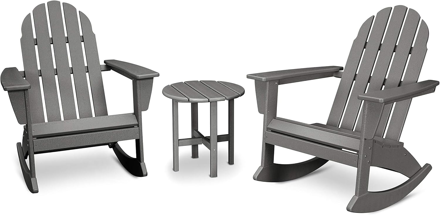 On a lazy summer afternoon, few things are as relaxing as rocking on your porch, sipping a cold drink, and watching the world go by. The POLYWOOD Vineyard 3-Piece Adirondack Rocking Chair Set (PWS408-1) is ideal for patios, decks, and other outdoor living spaces, with two Vineyard Adirondack Rocking Chairs (ADR400) and a Round 18" Side Table (RST18) to offer the perfect height for easy access to snacks and drinks. Wide rockers provide a smooth, gliding motion, while contoured seats and waterfall fronts increase your comfort and enjoyment. A range of smart, fade-resistant colors make it easy to coordinate your new seating set with other outdoor décor, and the set never needs painting or staining. If you’re looking for an attractive, long-lasting, and comfortable rocking chair set, the Vineyard 3-Piece Adirondack Rocking Chair Set checks all the boxes!