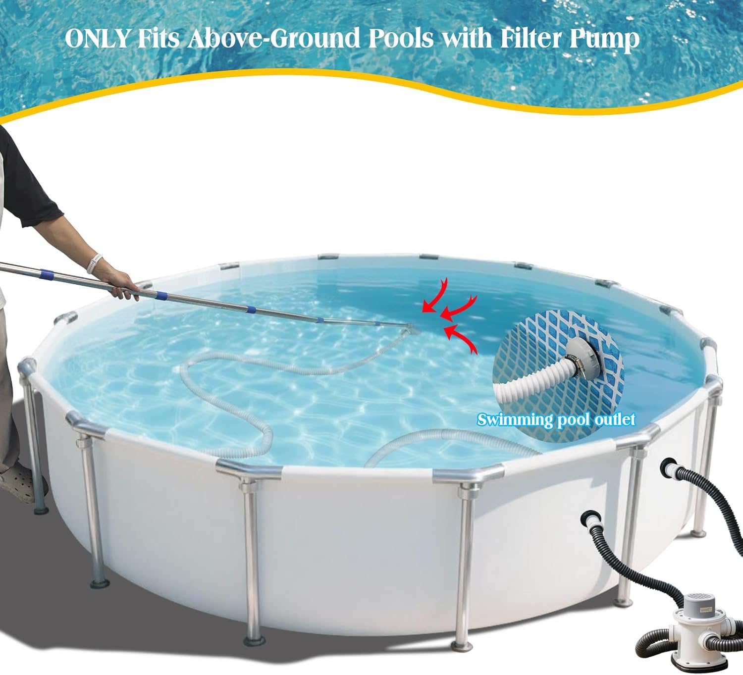 This versatile pool vacuum cleaner is designed to keep your above-ground pool sparkling clean with minimal effort. Featuring a flexible blue hose that extends from 53.15 inches to an impressive 157.48 inches, this cleaning tool provides exceptional reach to cover every corner of your pool. The extendable design includes durable stainless steel extension rods with blue protective caps that connect seamlessly to create the perfect length for your cleaning needs. The vacuum head features efficient bristles that effectively capture dirt, debris, and sediment from your pool floor and walls. Compatible with pools equipped with filter pumps, this vacuum connects directly to your swimming pool outlet for powerful suction. The flexible corrugated hose design allows for easy maneuverability around pool obstacles and tight spaces, while the sturdy construction ensures long-lasting performance season after season. The complete kit includes the main vacuum body with water outlet device, flexible extendable hose, and multiple extension rods for customizable reach. This practical pool maintenance solution makes routine cleaning quick and straightforward, helping you maintain crystal-clear water throughout the swimming season.