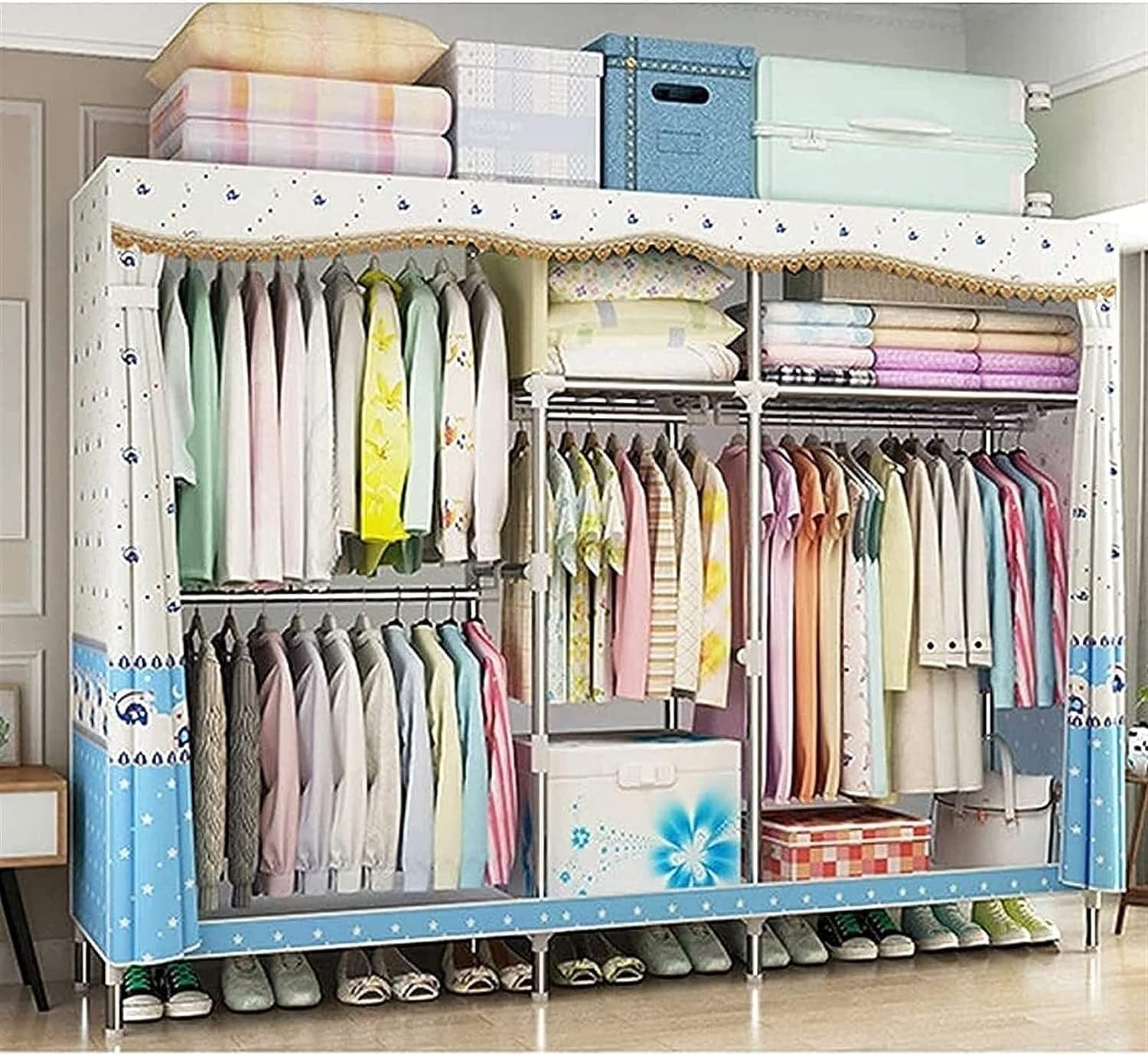 Welcome to my store! The portable wardrobe has a lot of space for you to store a lot of things, and the portable wardrobe is easy to assemble, disassemble and reassemble. You can store a lot of folded clothes or hang coats to keep your clothes in order. Easy to Use and Easy to AssembleSturdy ConstructionEasy to CleanSpacious Storage SpaceSimple Yet Stylish Look, Practical Home Temporary Niture, Keeping Your Home TidySpecifications:Fabric Material:Da ClothConnector Material: Pp Plastic PartsPipe Material:Galvanized Steel(25Mm)Product Size: 82.6" X17.7" X 66" (210X45X168cm)Tipe:after the Plastic Parts Are Soaked in Boiling Water for One Minute, the Installation is More Convenient.the Cut Surface of the Pipe is Dangerous, Please Do Not TouchPlease Confirm If Some Parts Are CompletePlastic Fittings, This Long Mouth is All Installed DownwardsPackage Content:1Xcloset WardrobeAfter-sales service:If you have any questions, please send us an email, we will reply to you within 24 hours and provide you with the best solution.
