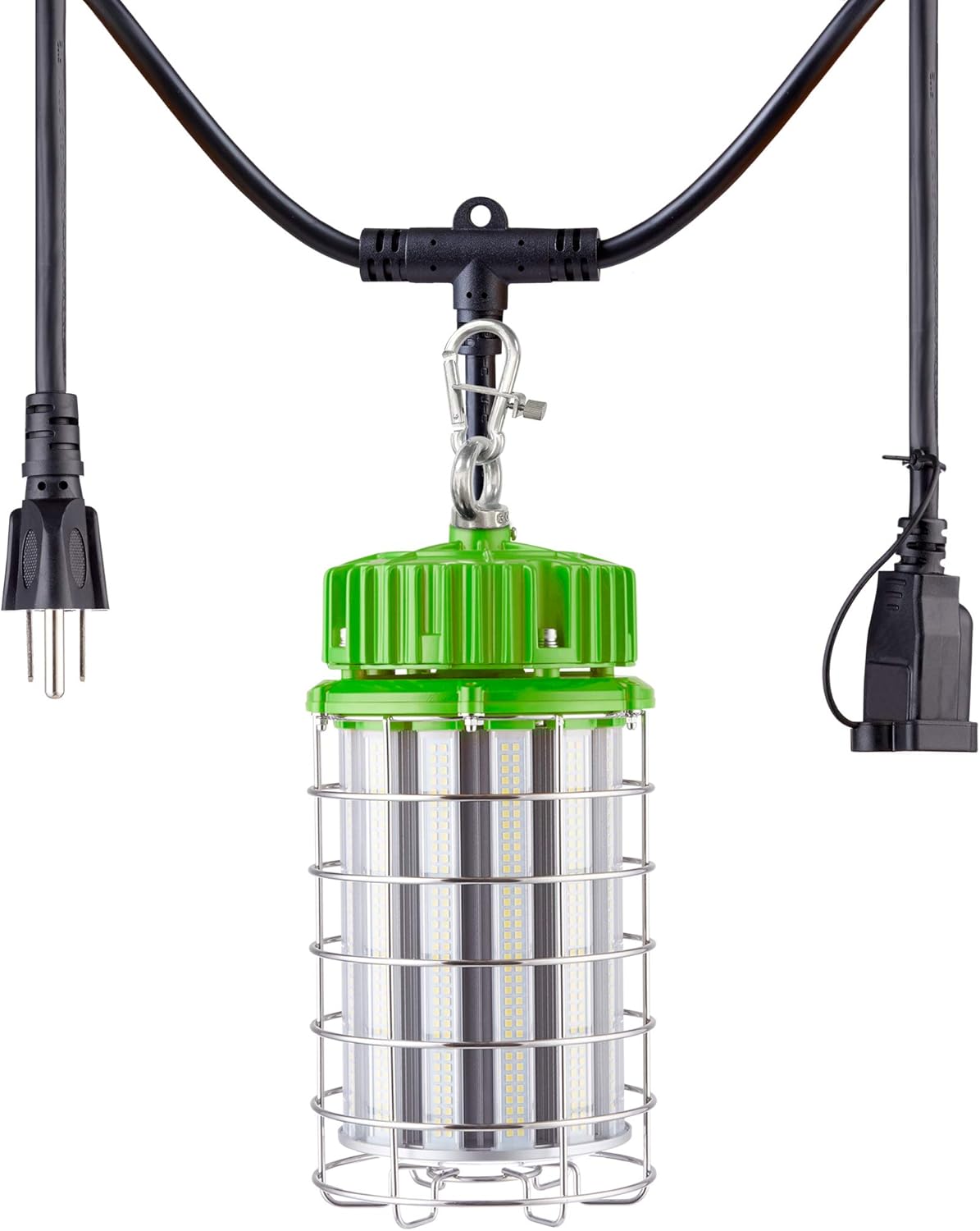 The ALL NEW Power Smith 18,000 Lumens High Bay LED Temporary Work Light delivers brilliant 5,000K light for your next industrial project. Whether it's lighting a hallway for a remodel or lighting a work area on the job, these High Bay LED lights lead in Lumens and capability. A metal carabiner secures the hanging light and a 10 ft. cord can be used to connect multiple high bay lights together with an onboard outlet for daisy chained operation. The all metal cage surrounding the light ensures that your light is ready for commercial and industrial use. An optional magnetic stand or metal stand can be purchased separately to increase the versatility of the light as well.
