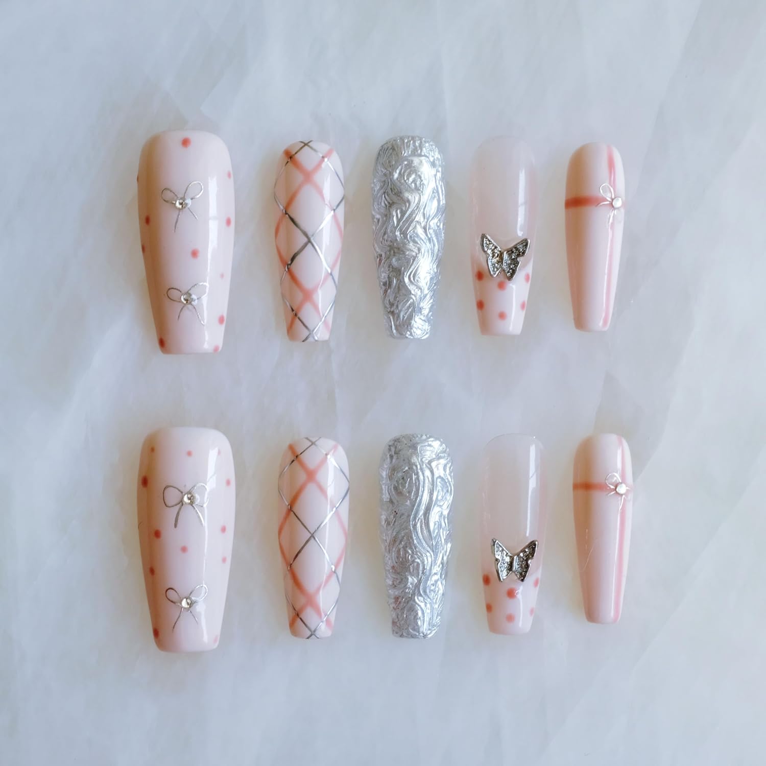 Transform your nails into wearable art with these stunning GLORS press-on nails. Each set includes 10 pieces of long ballerina-shaped nails featuring an enchanting island holiday-inspired design. The sophisticated pattern combines black and yellow hues with delicate mint accents, creating an eye-catching contrast. These salon-quality false nails are adorned with elegant 3D flower embellishments, sparkling crystals, and charming butterfly details that catch the light beautifully. The base features a classic French tip style with artistic patterns that give these nails a unique, premium look. Perfect for special occasions or when you want to make a statement, these press-on nails offer a professional manicure appearance without the salon visit. Each nail is carefully handcrafted to ensure exceptional quality and detail. The set provides everything needed to achieve a stunning, long-lasting manicure that will surely draw compliments.
