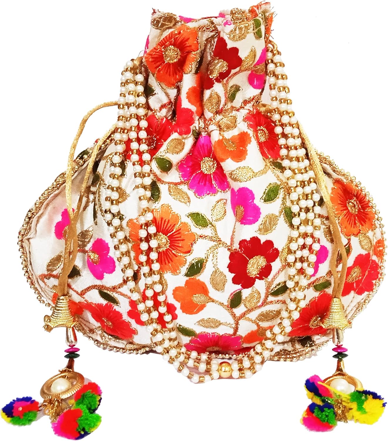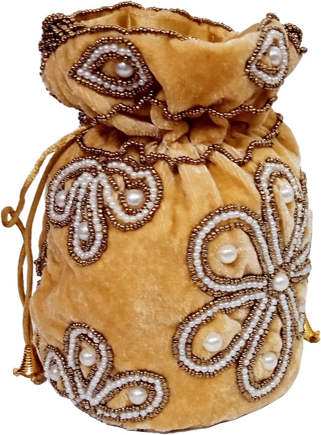 This Gorgeous Drawstring Potli Bag made of rich velvet cloth Has Intricate Golden Silk Thread Embroidery work. Comes With a drawstring with colorful tassles and a long beaded string that can be carried on the sholuder. Will Go Well With Both Indian Traditional Wear For Occasions Like Weddings, God Bharai Etc or a casual evening , dance , party. Also Perfect For Handing Over Wedding Gifts To Your Guests.