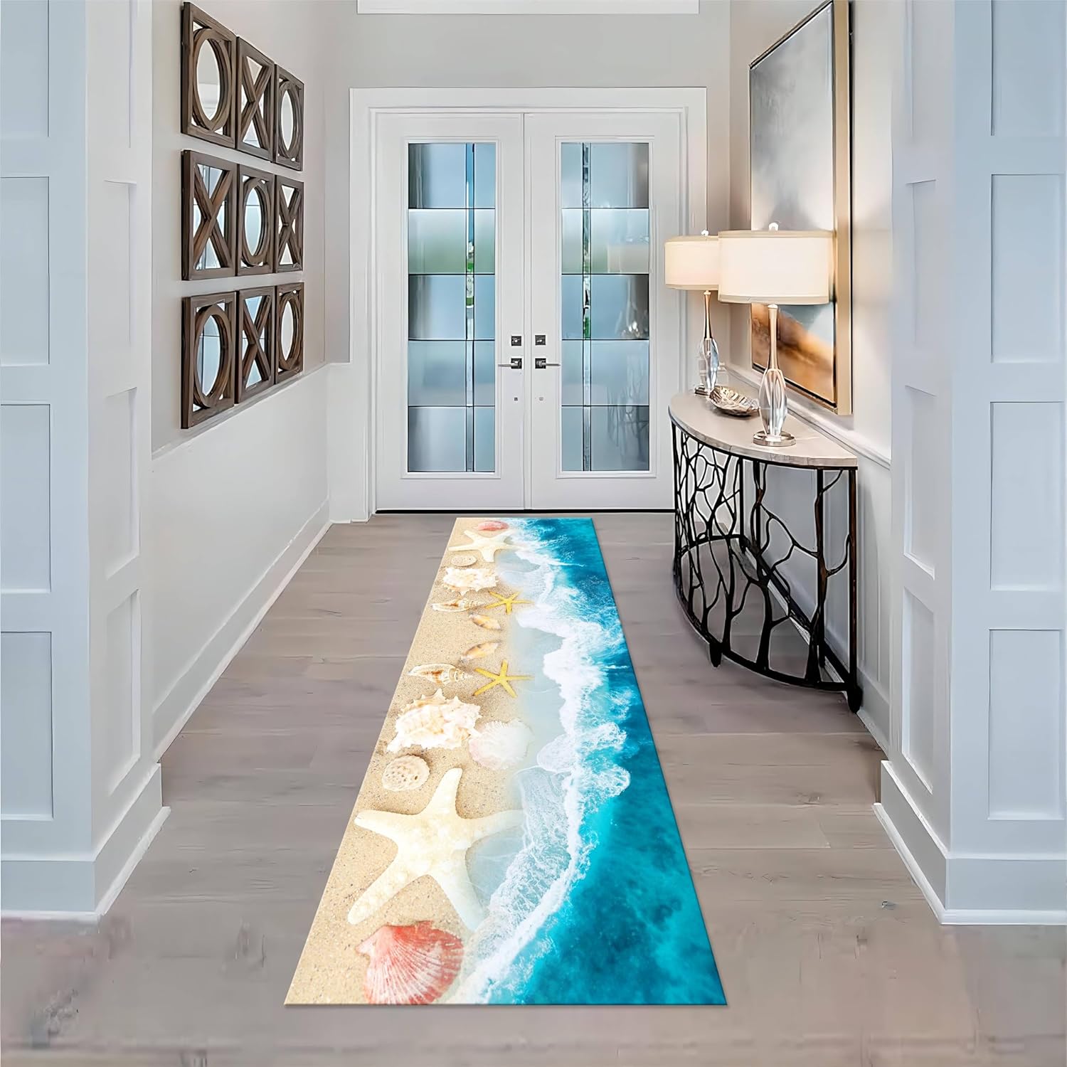 Introducing the Beach Corridor Rug Runner, the perfect addition to your coastal themed decor!feature:🐟Made from durable acrylic, this kitchen rug is non-slip and easy to clean, making it a practical choice for high-traffic areas.🐟The vivid colors and intricate details of this starfish rug with sea life and tropical plants will instantly transform your hallway into a beach vibe.🐟In addition to its beautiful visuals, this indoor rug is functional and practical. Its non-slip backing ensures it stays securely in place, preventing slips and trips even in busy areas.🐟Featuring a seashell and coral theme, this rug transforms any space into a charming seaside retreat, bringing the beauty of the ocean into your home.🐟Starfish living room rugs fit a variety of styles - modern, farmhouse, coastal, country, casual and transitional.Maintenance instructions:1.Wash separately and avoid soaking for more than 45 minutes.2.Cold water machine wash or hand wash, do not bleach, low temperature dry.Warm reminder:1.In order to facilitate transportation, the carpet is folded packaging, there will be creases after receiving the goods, and it will be restored after a period of time, which will not affect the use.2.If you find an odor after receiving the product, please expose it to air for a period of time.3. Due to different shooting angles and light factors, the actual color and the picture may be slightly different, please refer to the actual object.4.We provide the best customer service, if you have any questions or concerns about the purchase, please contact us and we will be more than happy to help you.