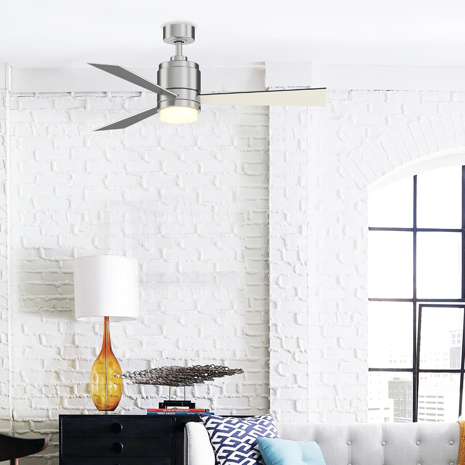 The Pylon 48 inch Indoor Ceiling Fan with LED Light Kit is all about bringing a simple, yet modern flair to your indoor space. This fan is rated for indoor use only, but its not just for looks ? its also powerful enough to push up to 4,889 cubic feet of air per minute on high speed, making it ideal for x-large rooms or large living spaces. Featuring brushed nickel finish from the Pylon collection, this ceiling fan includes 3 reversible blades in black/gray and a TR400S remote so you can control the fan from anywhere in the room. The integrated 18W light kit with frosted glass makes it easy to install a gentle glow above your homes centerpiece table or dining room chairs! Upgrade your existing fixture with this low-profile fan instead!