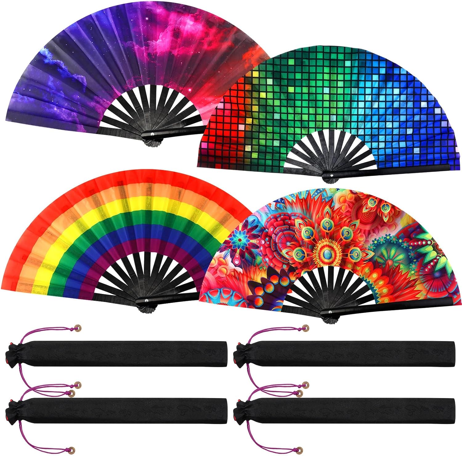 Dance Fan Set: the package comes with 4 pieces of craft fan folding fans, available in different patterns, 4 pieces of medium fan bags to protect the fan when you are not in use; The fans have an opening size of 13 x 25 inches and fold to 13 x 1 x 0.5 inches; A larger fan will give you more wind and relieve the summer heat
