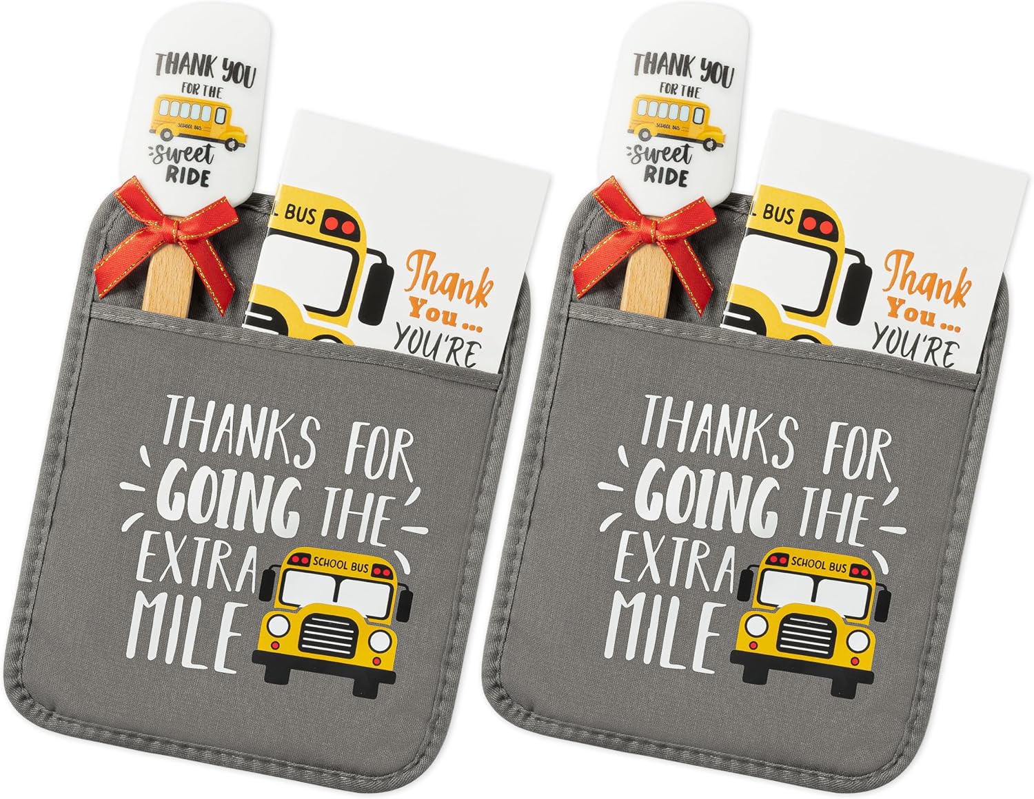R HORSE Funny Pot Holder with Silicone Spatula and Greeting Card for Bus Driver Retirement Teacher Appreciation Gift Specification: Material: Pot holder: Cotton Spatula: Silicone and wooden handle Card: Cardboard Packaging includes: 4 x Pot holders with pocket 4 x Silicone spatulas and ribbon bows 4 x School bus driver appreciation theme cards