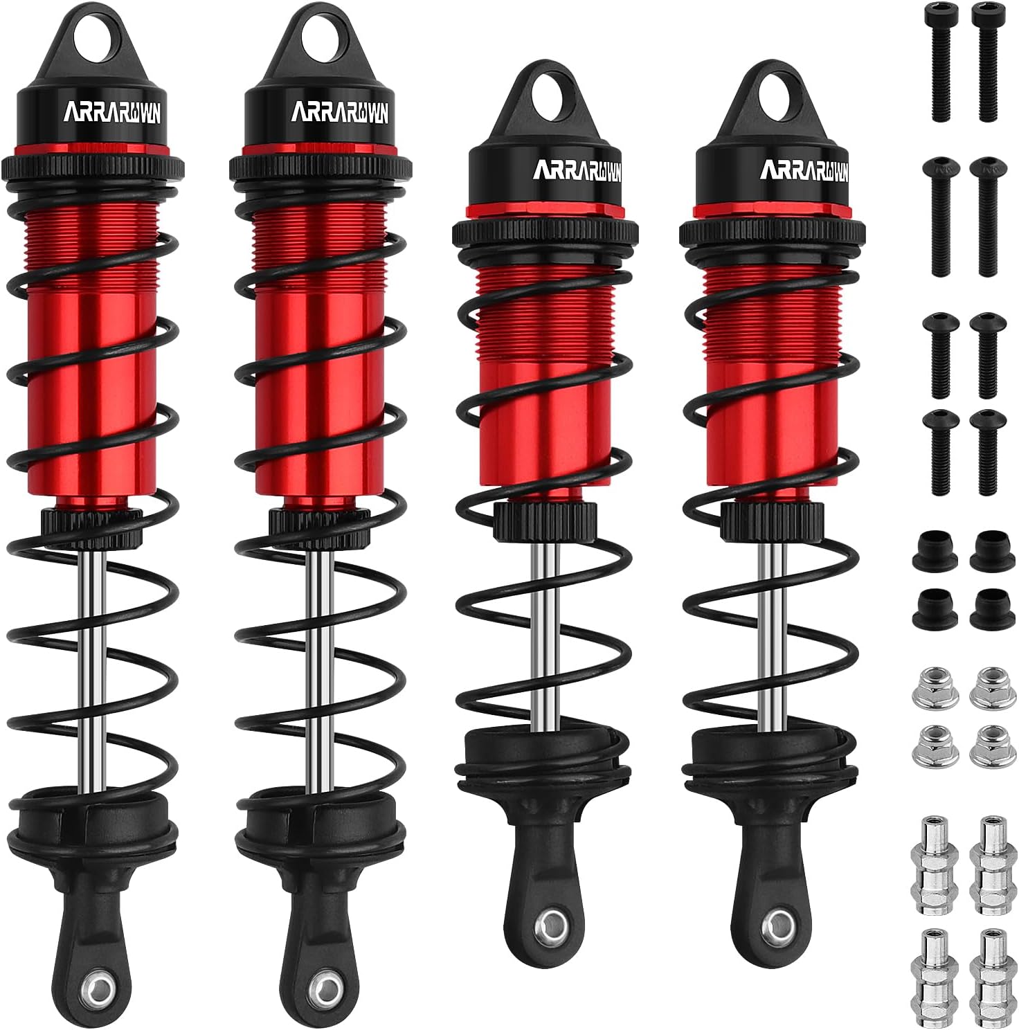 RC Shock Absorbers, 4PCS 130mm 1/8 RC Car Rear Shocks Set Adjustable Damper Springs Compatible with 1/8 HSP DHK HPI Arrma Typhoon 6S Redcat LRP Hobao FS/ZD Racing Hongnor DF-Model Buggy Truggy (Black) Features: ✔These oil rc rear shocks made of high quality alloys and CNC machined for precision, durability and long service life. ✔Exquisite appearance and good performance, minimalist color palette, take advantage of the big-bore design. ✔Professional shock absorption performance, equipped with high-quality springs,the spring of the shock damper is moderate in hardness and softness, excellent in toughness,reduce the shake, improve the stability of the rc car. ✔Replacement parts rc rear shocks, suitable for 1:8 scale, 1:7 scale rc off-road, buggy and Rally cars. ✔Compatible with Arrma 1/8 Kraton/Typhon/Outcast, Traxxas Sledge ALUM, Team Losi Racing 8IGHT-X/E 2.0, Team Associated RC8B4e, FS Racing 1/8 Atom Tank Sharks Leopard,Kyosho Inferno MP10Te, Mugen Seiki MBX8R ECO, RC Racing irates3 BX-8E and Notorious 1/7 Mojave etc. Notice: 1.Please check your specific model's manual for compatibility, in order to determine if the shocks are the right size. 2.Please tighten the nut under the spring to prevent oil leakage before use. Specification: Item: 4Pcs 1/8 Alloy Rear Shock Absorbers Item Type: 1/8 RC car accessory, replacement parts, update parts Color: Red, black Dimension: RC Rear Shock Absorber: Total Length: Approx.140mm/5.52inch Hole center to hole center: Approx.130mm/5.12inch Notice: before purchasing, please measure the distance from the screw hole to the screw hole(eye-to-eye) of the original rear shock absorber. and compare the size of our these shocks. Package Include: 4x Alloy Rear Shock Absorbers 4x Shock Absorption Mounting Post 8x Hexagon Nuts 8x Screws