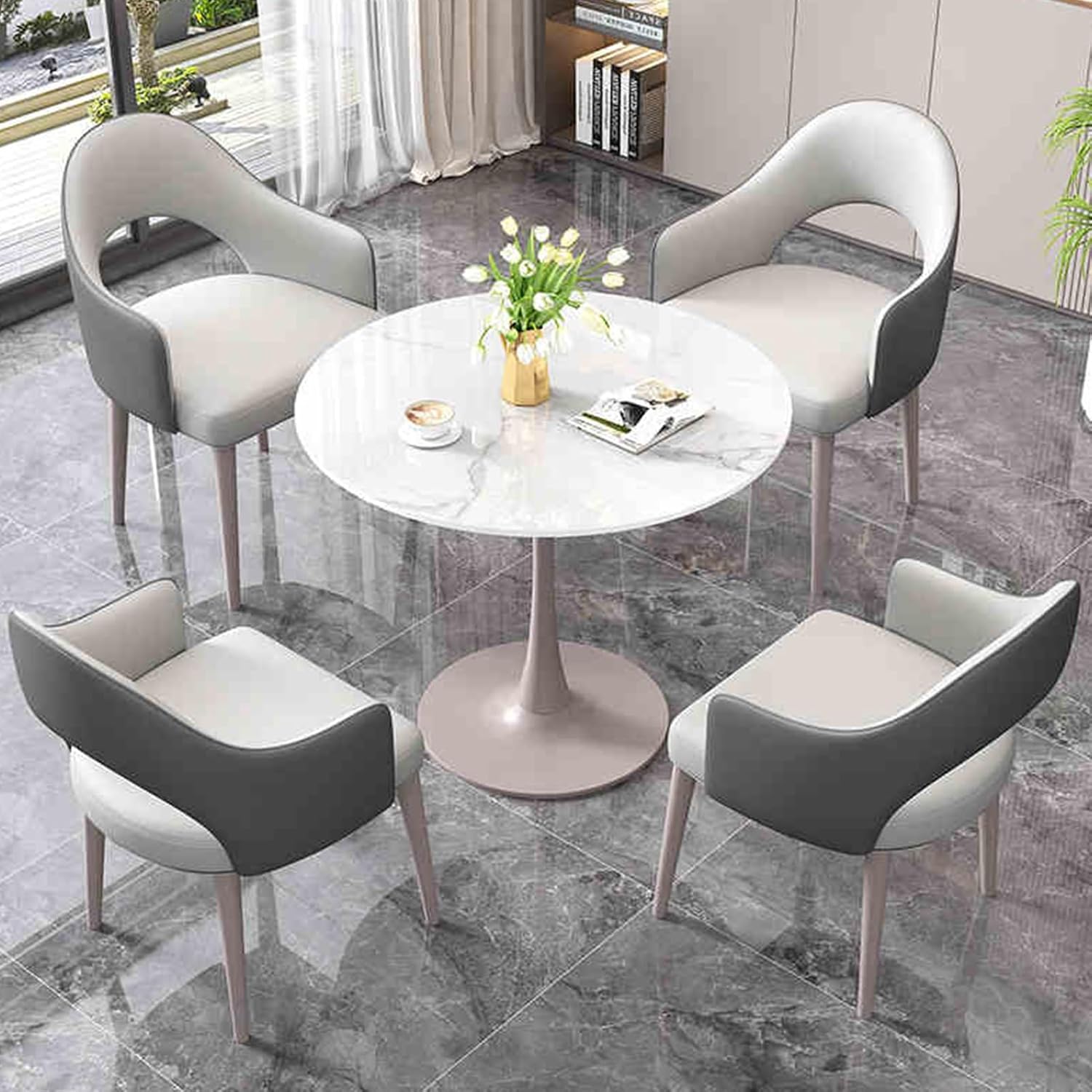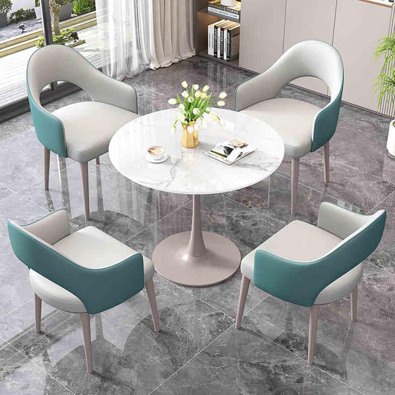 Fascinating Business Reception Negotiation - Small Conference Desk & Chair Set - Meeting Room Table and Chair Set will complement any Office or home décor The ergonomically curved seat can protect your spines for long-term seating Product Name: office reception room club table and chair set Table material: E1 grade high density board Chair material: PU leather Table size: diameter 80cm/31.4in Packing: 1x table, 4x chair (other things are decorations, not included) Applicable scenes: office, coffee shop, tea shop, reception, restaurant, library, cinema, clothing store, maternal and child shop, living room, etc. Please note: 1. While we display colors as accurately as possible, due to differences in computer monitors, colors may vary. 2. Due to manual measurement, there may be an error of 1-3 cm in the product size.