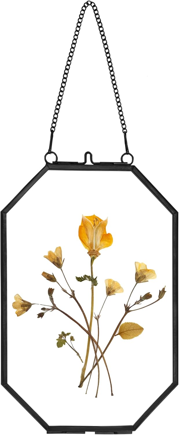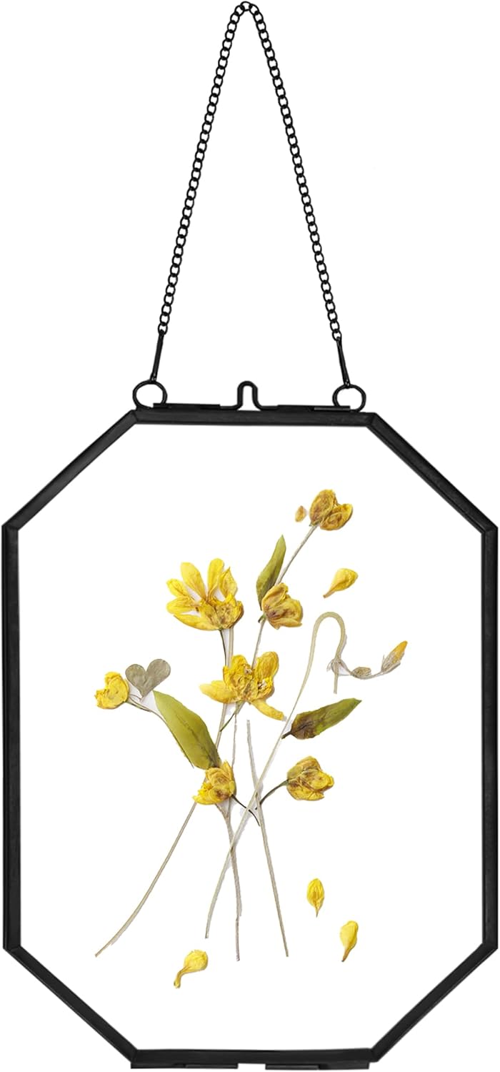 REDHUGO Pressed Flower Frames, Glass Floating Frames for Display Dried Plant Specimen Picture, Hanging Brass Photo Frame with Chain, Double Clear Glass, Vintage Wall Decor, Octagon, Gold, 8x10 Inches