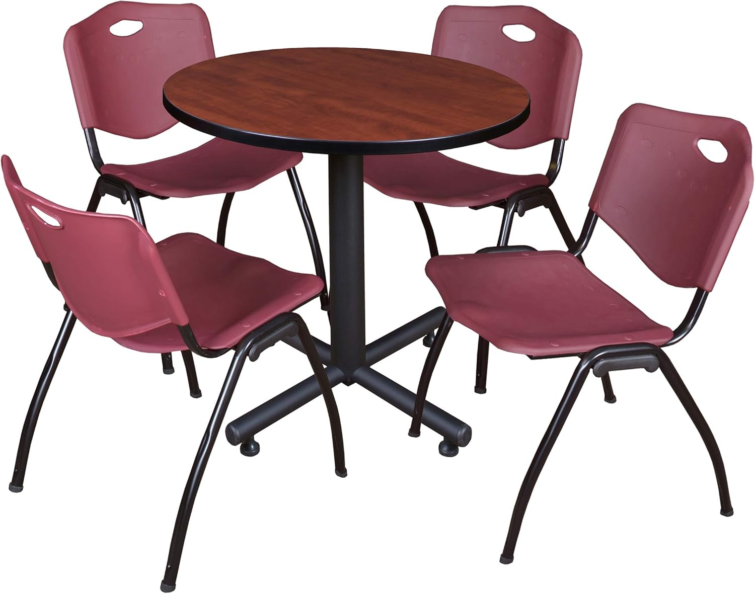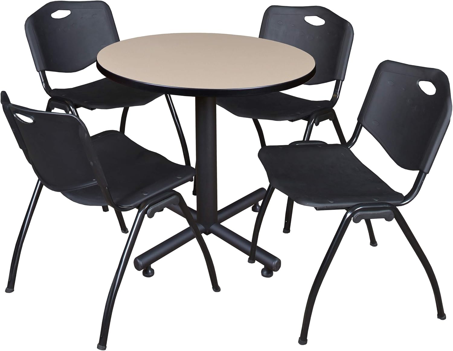 The 42" round table top is constructed of thermal fused melamine that protects against stains, burns, bumps and bruises. A black PVC edge adds extra protection. The Kobe x-base is constructed of black tubular steel with a smooth powder coat finish. Table feet feature adjustable glides and end caps for a clean finish. Table is ideal for training rooms, lunch rooms, restaurants, cafes, or small conference rooms. The m stacker chairs feature sturdy black metal frames, glides to eliminate floor damage, color permeated seat and back, convenient built in handle, can be stored in stacks on 12.