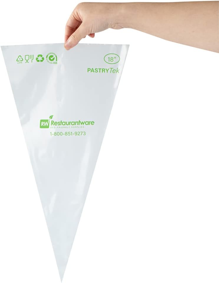 Add swirl icing to your cupcakes with our Pastry Tek Clear Plastic Pastry Piping Bags. Designed with a partition running down the middle, these dual-color icing bags allow you to fill each compartment with different-colored buttercream so you can easily add stripes or swirls to your cakes. Made with three layers of plastic, these two-color decorating bags have 60 micros in each layer, making them thick to avoid rips and tears while piping. The crystal clear finish of these icing bags allows you to quickly identify the color combinations you want to use while decorating. For a sustainable and effortless cleanup after finishing your cupcakes, these icing bags are disposable. These piping pastry bags measure 17.7 inches long by 9.5 inches wide. Sold in a 100 count box.
