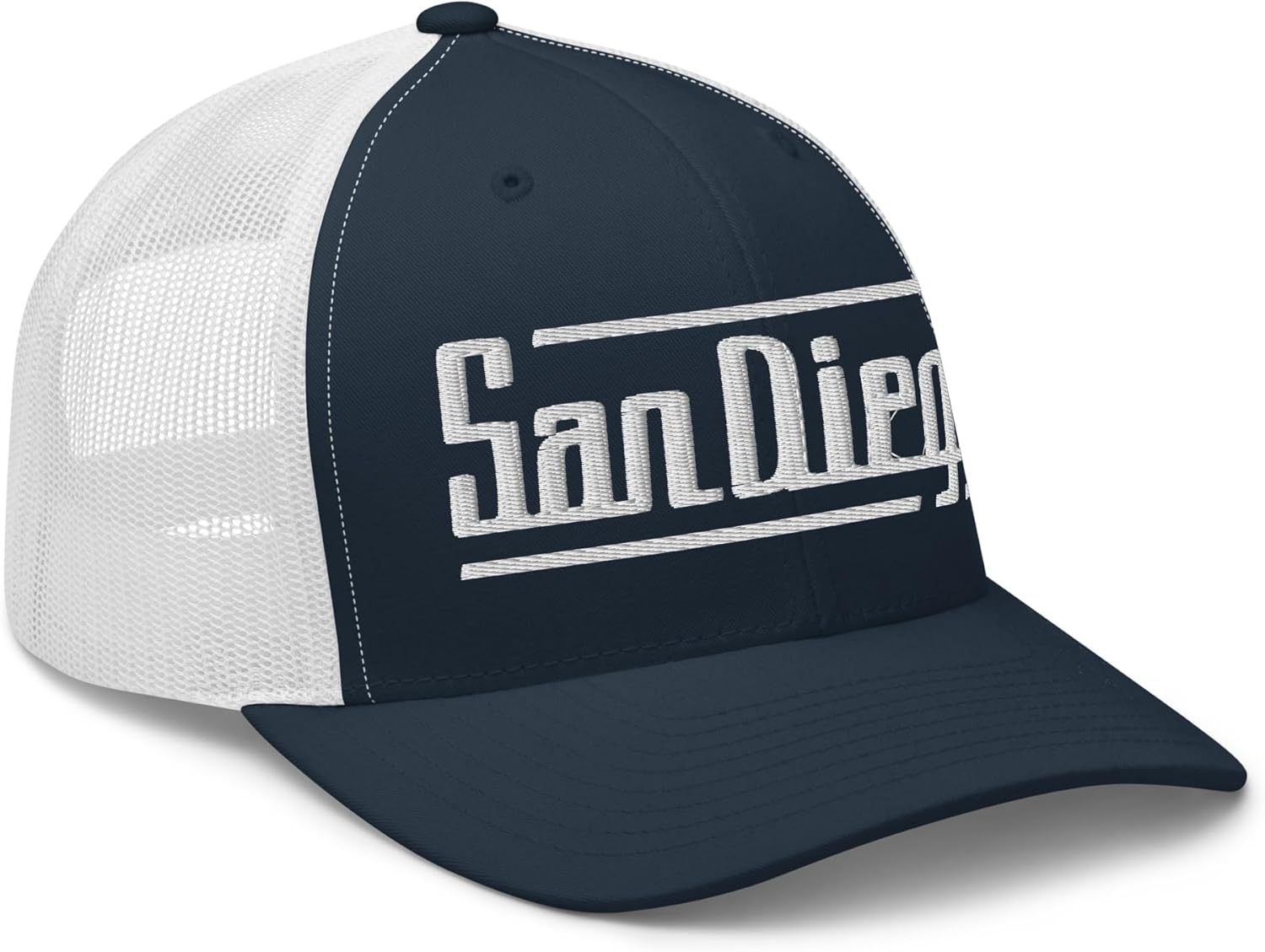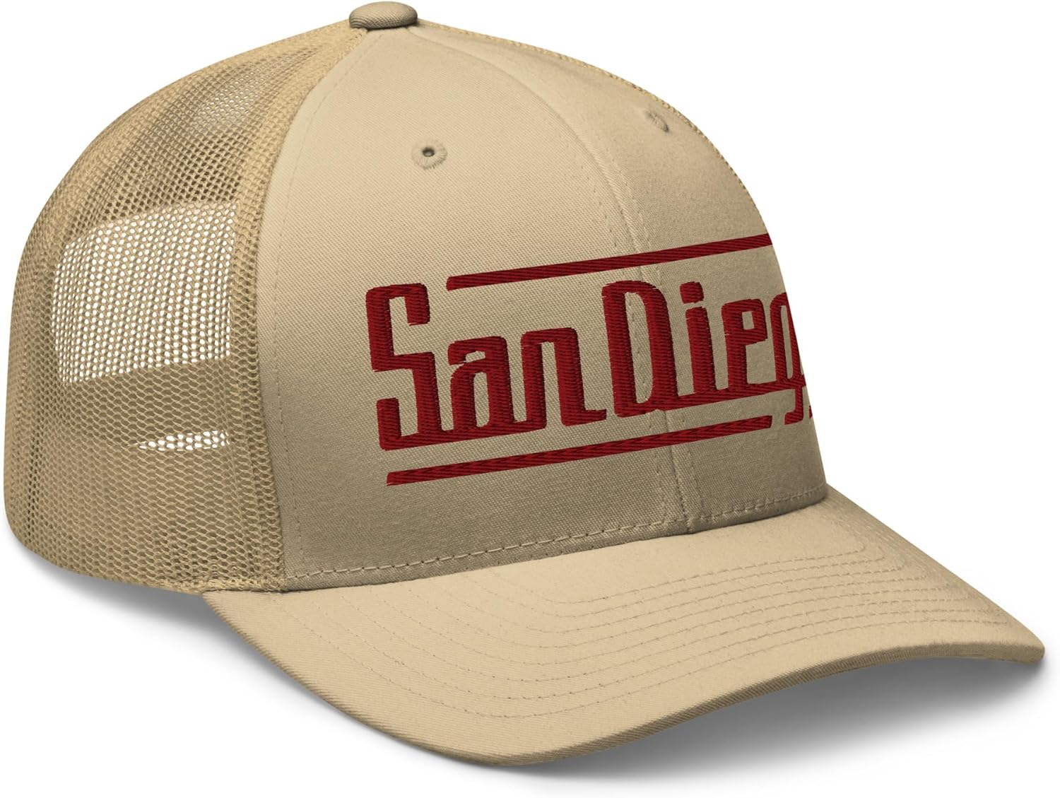A unique and stylish San Diego hat with a mesh back and mid-profile, 6-panel construction, this retro San Diego trucker cap features a vintage San Diego, CA design that is sure to be appreciated by anyone who loves SD -- America's Finest City. Available in a variety of color options, it's an awesome way to display your San Diego pride and would make a great gift for dad, husband, grandpa or San Diego, California fan. Mid-profile, structured 6-panel San Diego trucker hat60% cotton, 40% polyesterHard buckram front panels w/ mesh backPermacurv visor, matching undervisorPlastic snap closureHead circumference: 21 ⅝” – 23 ⅝”Type: San Diego CA hat, mesh trucker capEmbroidered in the USASan Diego GoTime Apparel