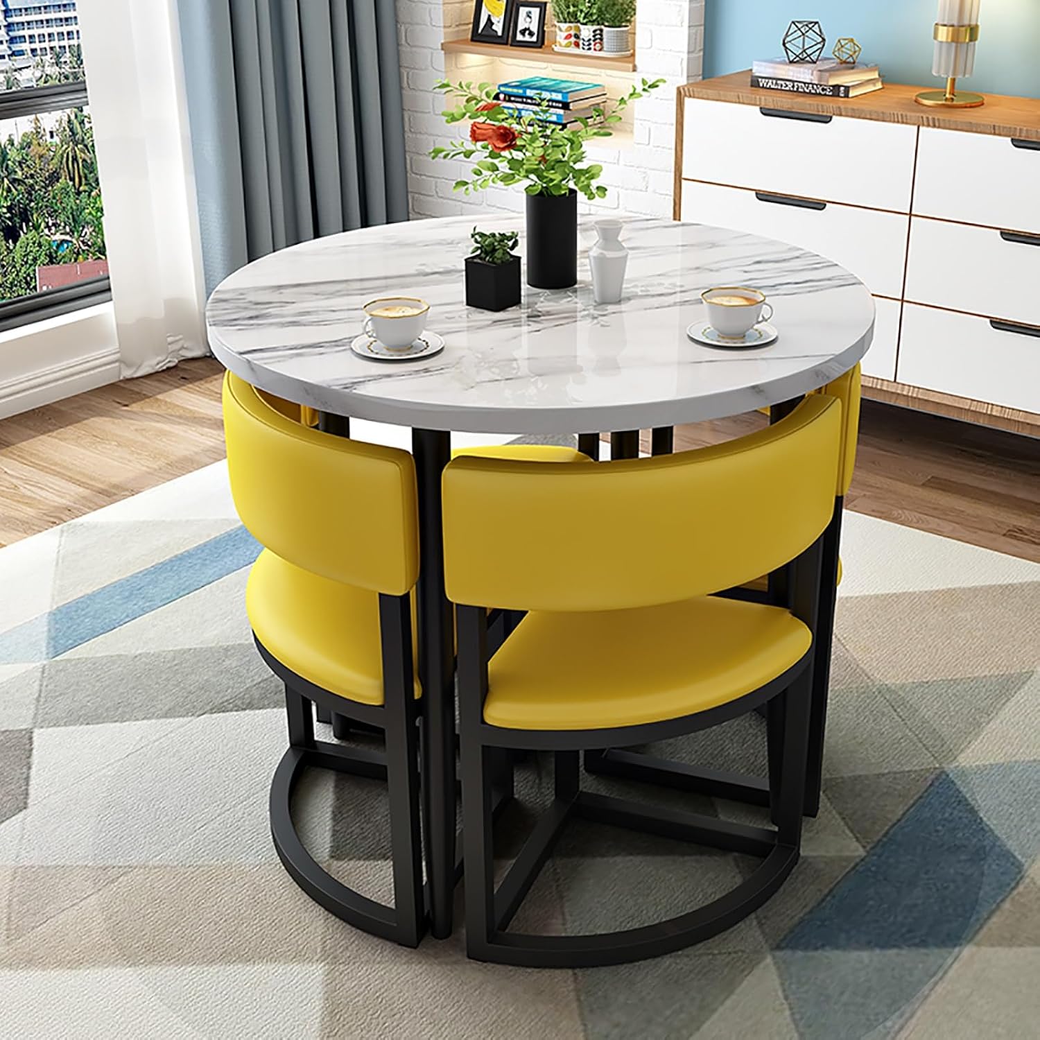 √ Charming Business Reception Negotiation - Small Conference Table and Chair Set - The conference room table and chair set will match any office or home décor.√ Cafe casual table and chair set, in the office reception room, this office desk and chair set can also be used as a small dining table in the kitchen or a small conference table in the office.√ This table and chair set can also be placed in your beauty shop, nail salon, beverage shop, hotel lobby or versatile commercial store.Product name: Table and chair combinationFeatures: simple, generous, space-savingColor: Various colors availableStyle: simple and modernBracket structure material: metalTable shape: roundDesktop material: E1 high density boardTabletop diameter: 80cm/31inches,Desktop thickness: 25mm/1inchTable height: 75cm/29.5inchesCountertop load-bearing: 300KGChair material: cotton and linen fabricOverall chair height: 72cm/28.3inches,Seat height: 43cm/16.9inches,Seat depth: 42cm/16.5inchesSeat load-bearing: 100KGApplicable number of people: 4 peoplePackaging: AssembledPacking list: 1*table, 4*chairs