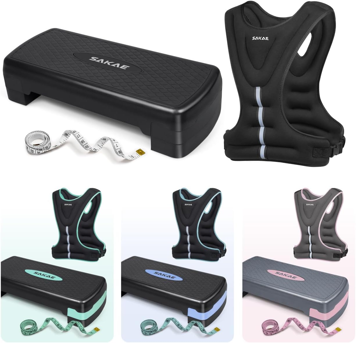 SAKAE Aerobics Step Platform Set with Weighted Vest & Measuring Tape, Adjustable Height 2 Level Risers Workout Step Trainer with Non-Slip Surface, Step Platform for Home Exercise, Multiple Colors