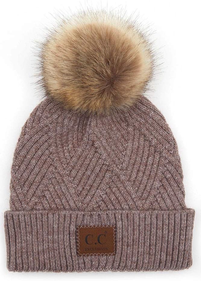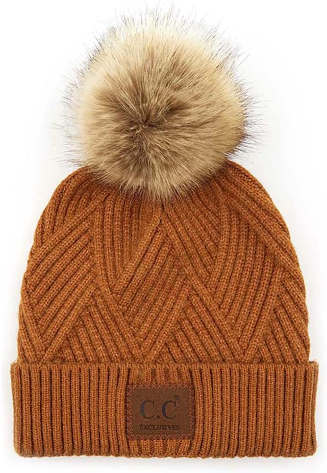 ScarvesMe Exclusive Heather Suede Patch in Diagonal Stripes Criss Cross Beanie Hat with Cuff and Pom