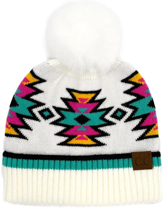 ScarvesMe Women's Winter Soft Knit Aztec Pattern Beanie with Faux Fur Pom