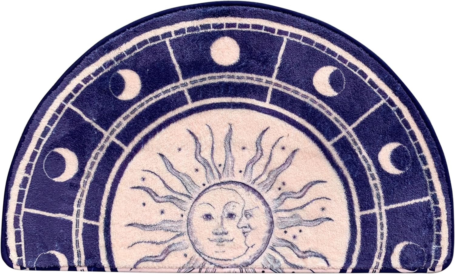 Transform your bathroom into a celestial sanctuary with this enchanting semi-round boho bathmat featuring whimsical sun and moon designs. This half-circle rug adds a touch of bohemian charm to your space while serving a practical purpose with its non-slip backing for safety. Perfect for bathroom entryways, this washable mat combines style and functionality. The unique semicircle shape makes it an ideal fit against walls or doorways, while its indoor-friendly construction ensures durability for daily use. The artistic sun and moon motif brings a playful yet sophisticated element to your bathroom decor. This versatile floor mat works beautifully as a bathroom accent, but can also enhance other areas of your home. The washable feature makes maintenance a breeze, helping to keep your space fresh and inviting. Whether you're completing a bohemian-themed bathroom or simply want to add a distinctive decorative touch, this non-slip mat delivers both style and practicality.
