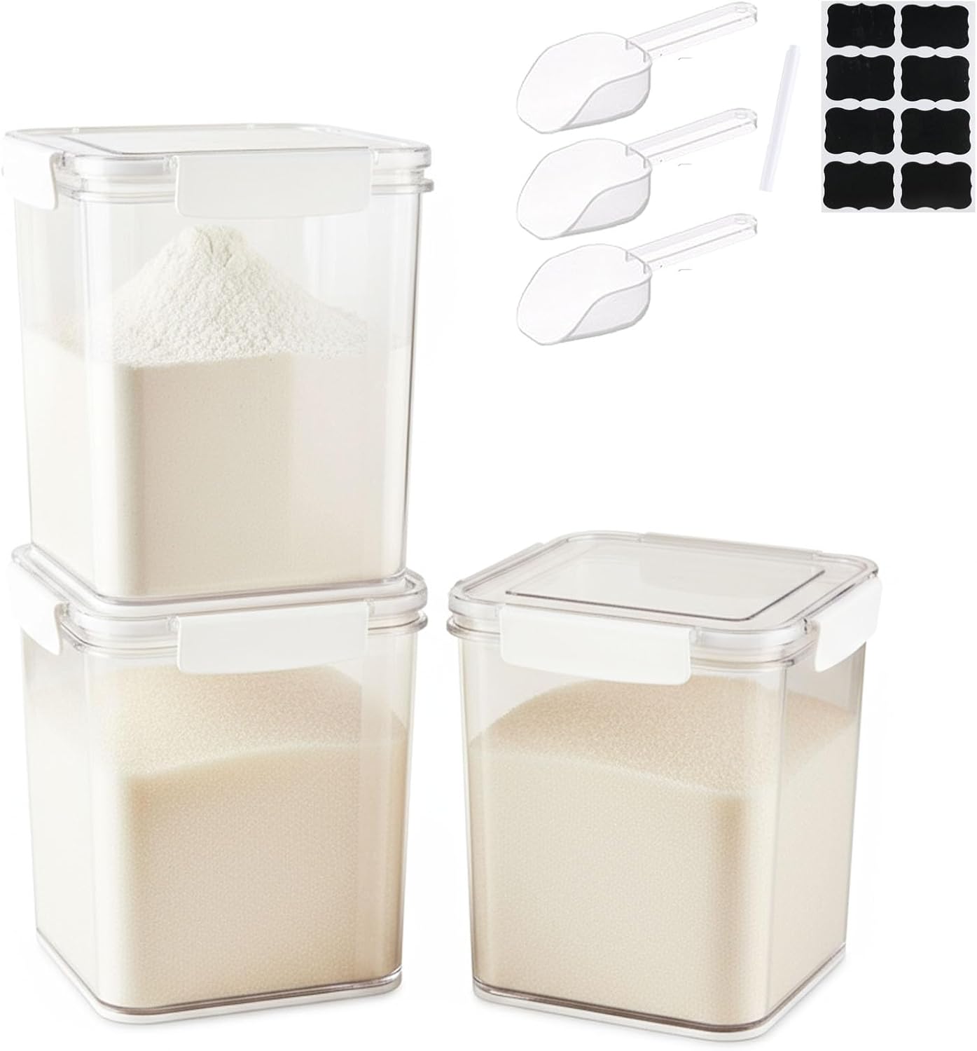 Introducing our Set of 2 Large Food Storage Jars, each with a 5 capacity, designed to meet all your kitchen storage needs. These white containers are perfect for storing sugar, flour, and other kitchen essentials, ensuring your pantry stays organized and your food stays fresh. Each jar comes with a free spoon for easy scooping and measurement. Our food storage jars feature a four-side locking system with a thick silicone sealing ring, providing an airtight and moisture-proof environment. The transparent material with a clear capacity scale allows you to see the contents and monitor the quantity at a glance. The large opening design makes it easy to fill and scoop out contents, ensuring convenience in every use. These jars are not just functional but also stylish with their modern design, making them a great addition to any kitchen decor. Whether you’re storing coffee, rice, pasta, or cookies, these versatile containers will keep your food items fresh and neatly stored. Perfect for everyday use, our storage jars are made from durable, high-quality materials, ensuring they stand up to regular use while maintaining their look and functionality. Keep your kitchen counter tidy and your food safe with these reliable storage solutions.