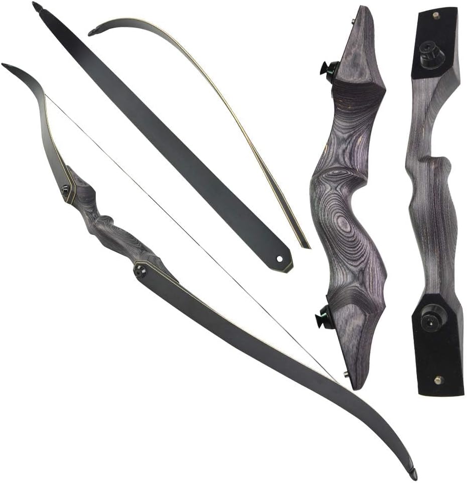 Archery Traditional Recurve Bow Color: Black, Red Draw Weight: 30lbs, 35lbs, 40lbs, 45lbs, 50lbs,55lbs,60lbs Bow Length: 60inch String Length: 57inch/145cm Handle length: 15inch/38.1cm Draw Length: 30inch/76.2cm Bow weight: 1kg Bowstring Material: imported string The bow limbs are made of laminated wood and fiberglass The bow handle is made of high-density wood Item name: archery carbon arrows Shaft material: carbon fiber Outer diameter: 7.8mm Inter diameter: 6mm Arrows nocks: black Arrows head: 100grain Fletching: 2green and 1black 4inch turkey feather Weight: 34.8g Total length: 80.4cm/31.9Inch Standard length: 77.5cm/30.7Inch Package include:1 x Recurve Bow or 1 x Recurve Bow+6pcs carbon arrows Note: Right handed means, you will hold the archery bow with your Left hand and draw with your Right hand. The Bow is shipped with riser/limbs/string taken down. You need to assemble them by yourself after you receive it. The double-curved design of the bow handle is used to make your arrow and bow have a small contact area when you shoot the arrow, which can reduce the interference of the handle on the flying arrow. The bow and window uses a 5/16 window design. When you stick the fur arrow and use the 8mm diameter arrow, the arrow will directly aim at your target, making it easy for you to hit the target. The grip part uses a push design.