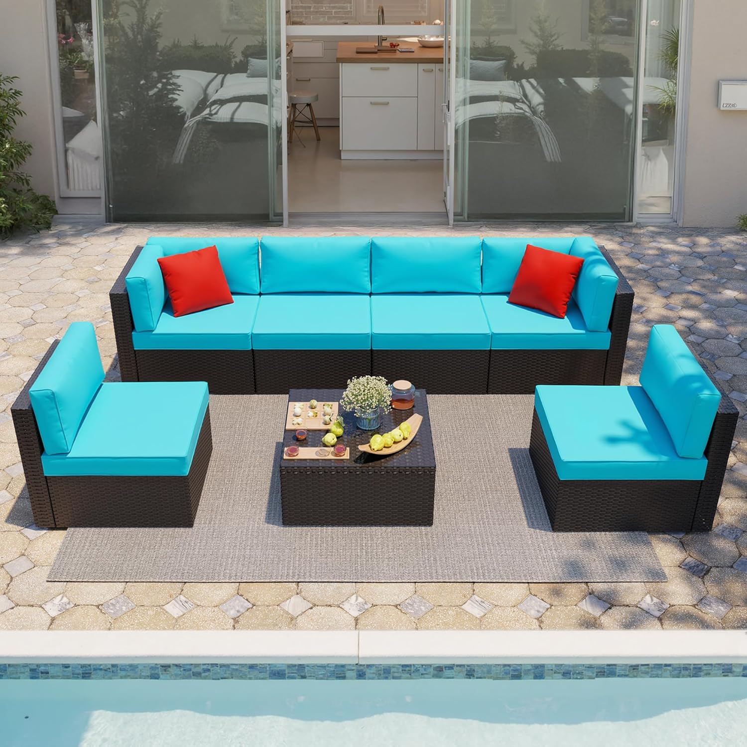 The new 7 Pieces Patio Furniture Sets don't just add a chair and cushions, they add a myriad of possibilities to your furniture combination. Whether it's outdoor patio, patio, backyard and patio, this product can perfect blend in any environment. Put together, this unit strikes a streamlined U-shaped silhouette featuring a full back, clean-lined apron, and hidden block feet, while water-repellent polyester-blend cushions line its seat and backrest for comfort and support.