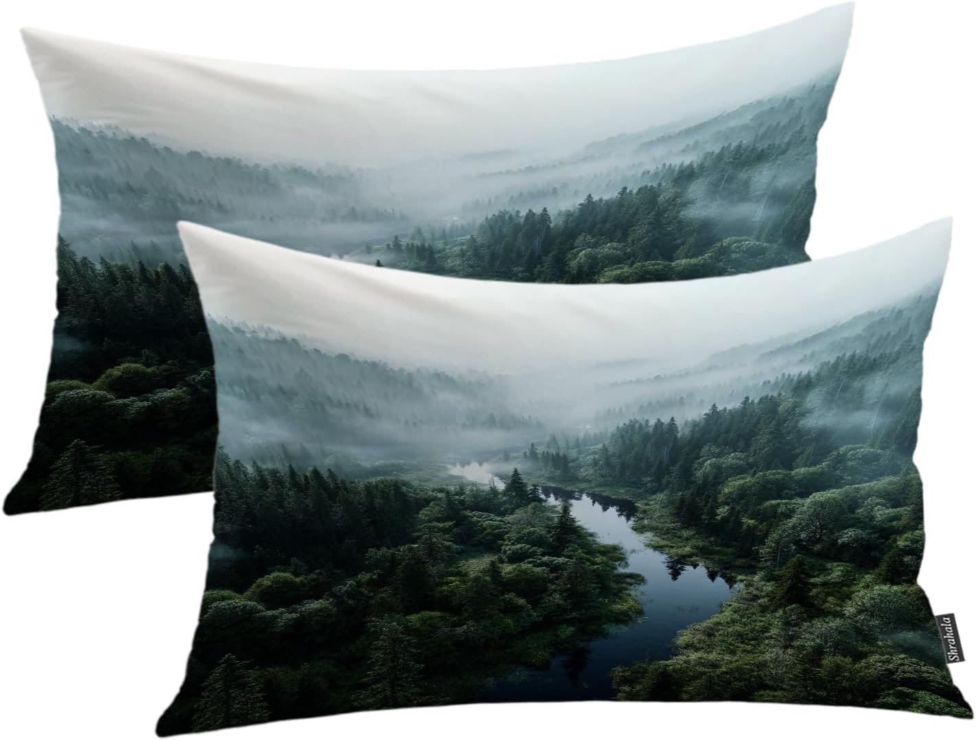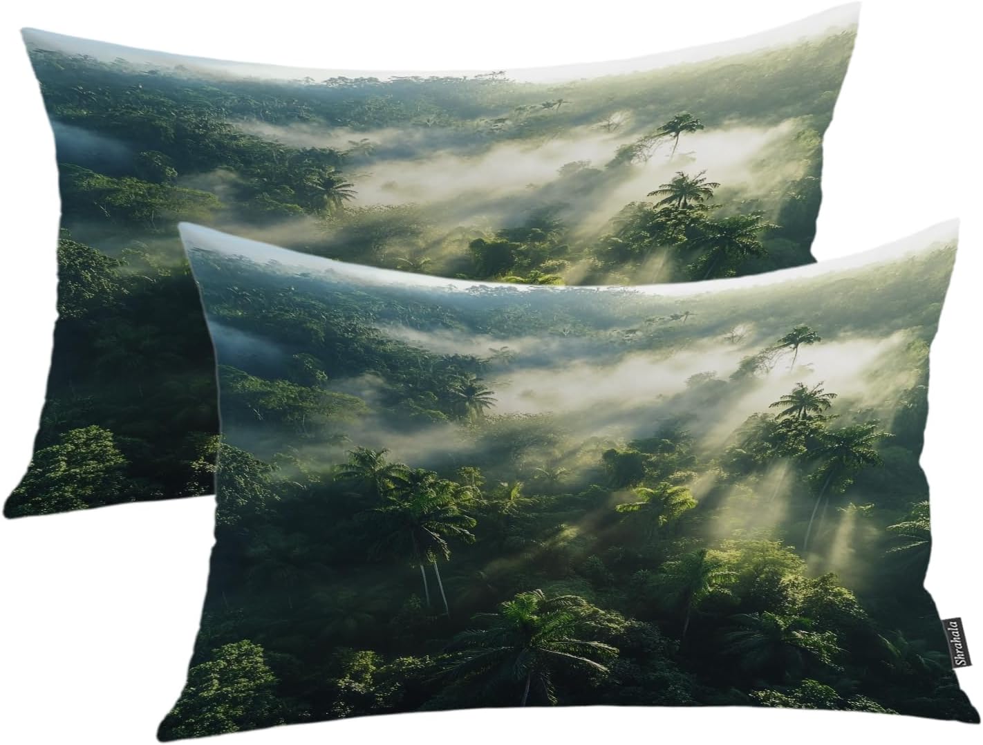 Shrahala Dense Foliage Misty Atmosphere Decorative Throw Pillow Cover, Sunbeams Tropical Vegetation Square Pillowcase Blended Double-Sided No Inserts for Bedroom Living Room Set of 2 (20 x 20 in)