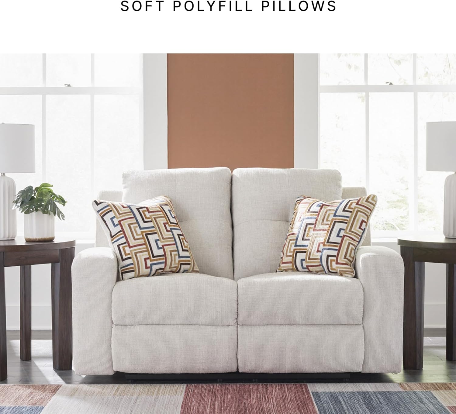 The Danum Reclining Loveseat combines contemporary style with ultimate comfort for your living room or family space. Upholstered in soft polyester fabric, this loveseat features a chic neutral hue that complements modern color palettes. A tufted back adds a stylish touch, while attached cushions filled with durable foam wrapped in poly fiber provide lasting support. The pull tab reclining motion makes it easy to transition from sitting to lounging, and the zero wall recliner design saves space by requiring minimal clearance from the wall. A reinforced frame and metal seat box ensure stability for everyday use, while included accent pillows with soft polyfill add an extra layer of coziness. Perfect for relaxing after a long day or enjoying movie nights, this reclining loveseat blends function and fashion for a piece that fits seamlessly with sofas, couches and other living room furniture.
