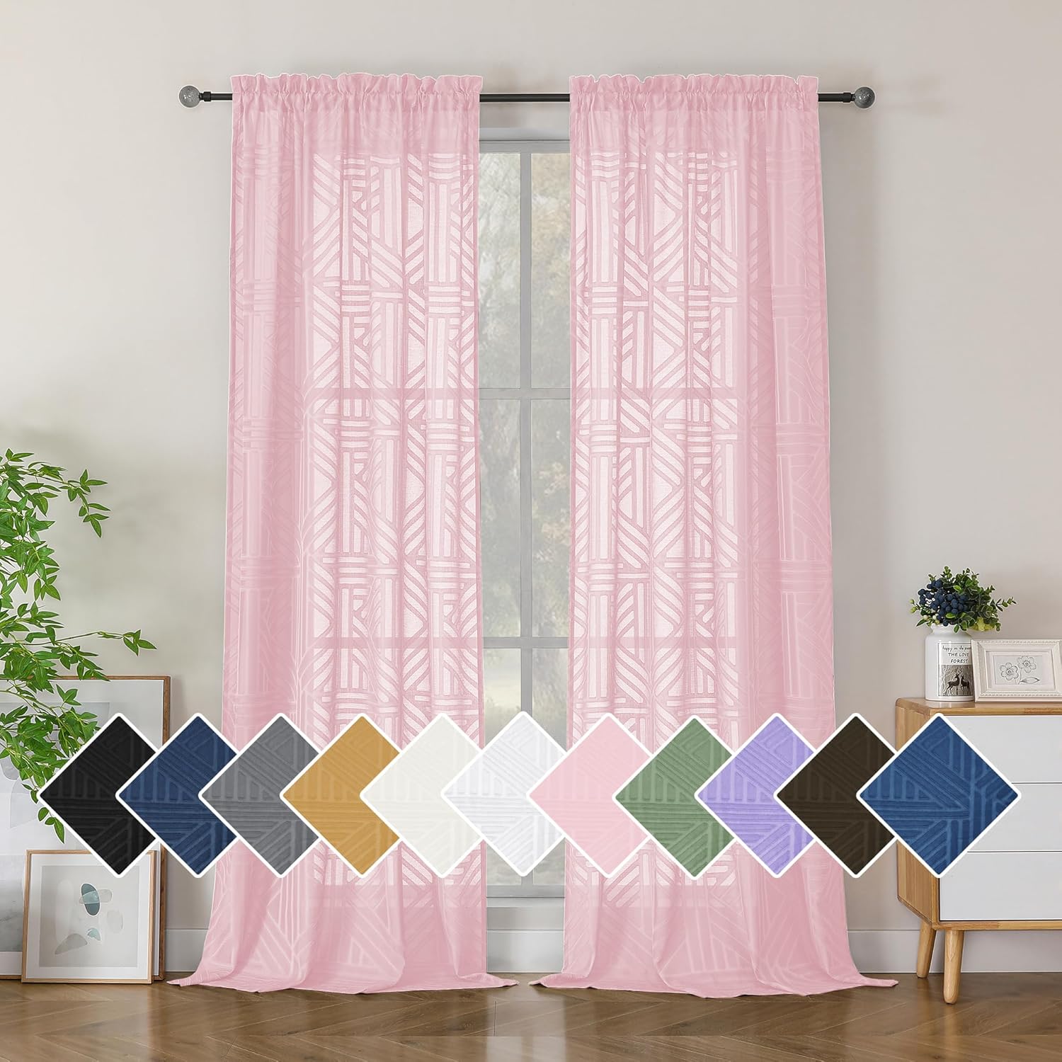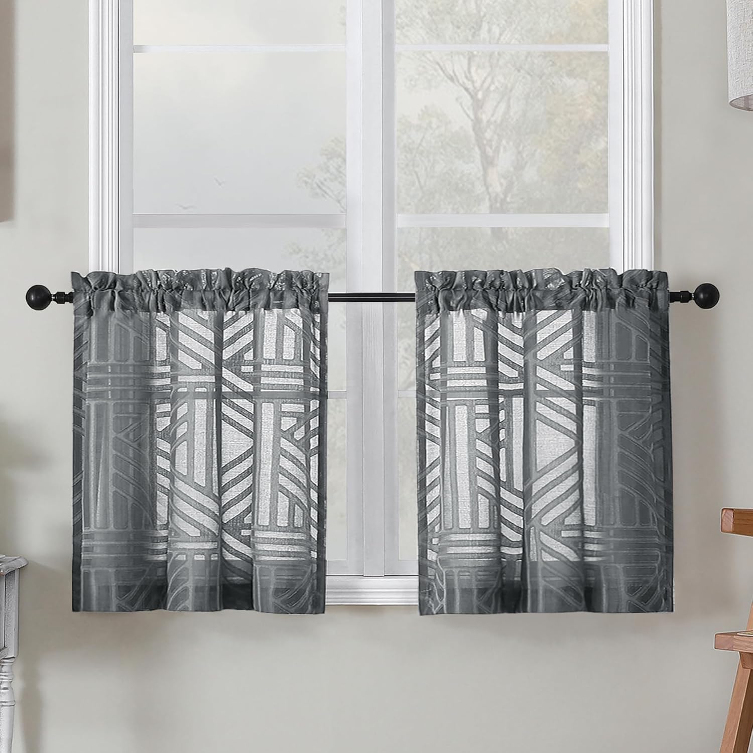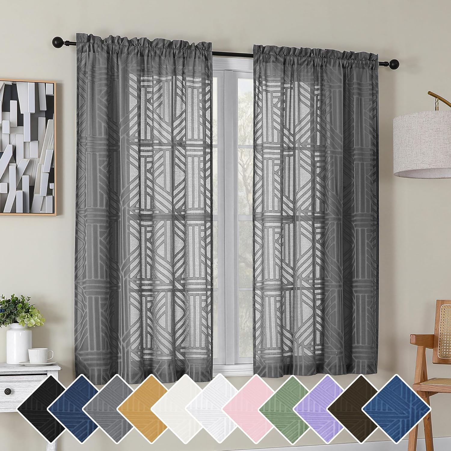 Simplebrand Semi Sheer Charcoal Grey Curtains 90 Inches Long 2 Panels, Light Filtering Geometric Jacquard Clip Textured Sheer Curtains for Living Roon,Modern Elegant Window Curtains Drapes,52x90 inch
