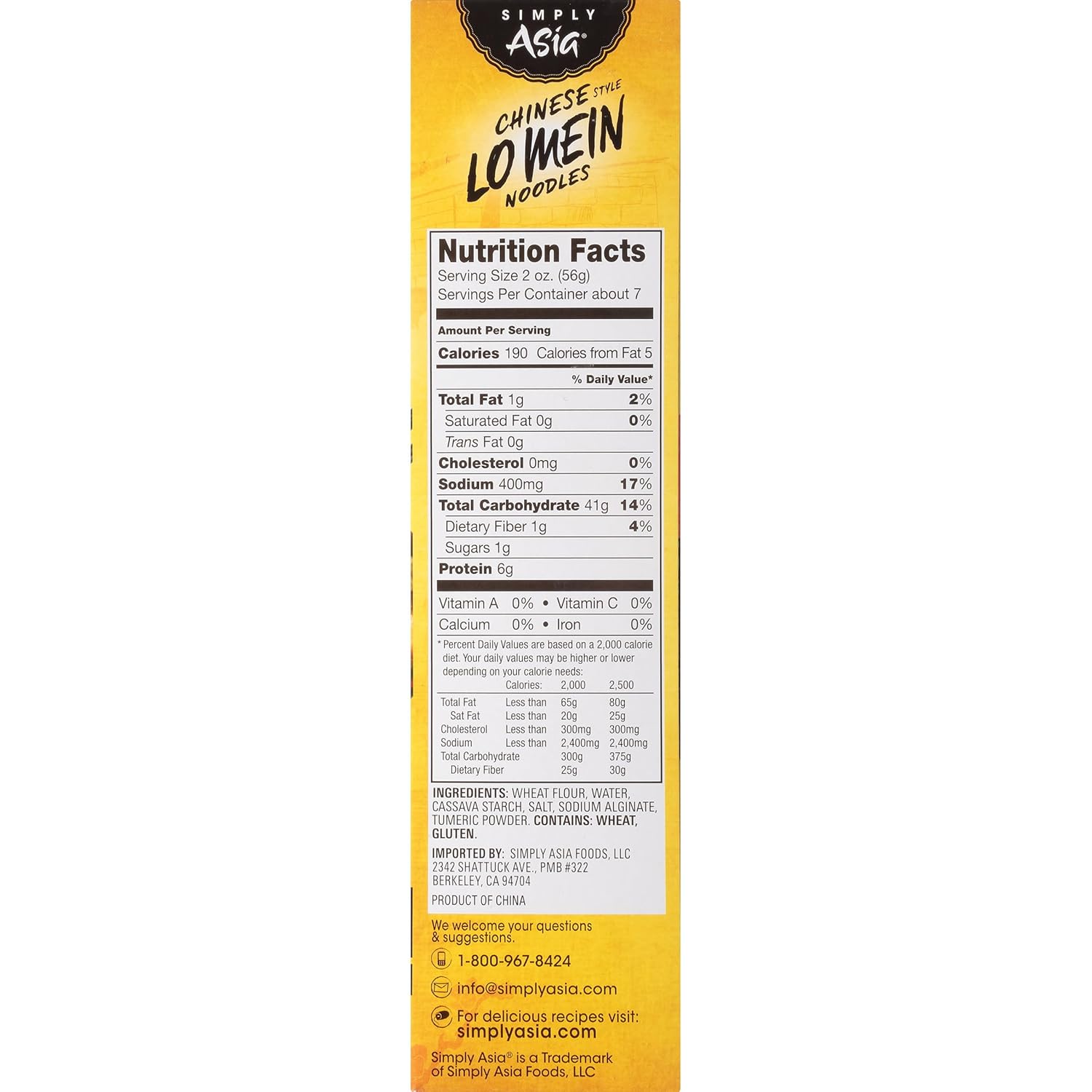 Simply Asia No MSG Chinese Style Lo Mein Noodles, These are perfect for absorbing the rich sauce that is traditional to lo mein dishes and ready in 6 minutes! Just add chicken and veggies. This Simply Asia Chinese Style Lo Mein noodle is in a Cardboard box that is 14 ounces. Store this shelf-stable item at an ambient temperature. No MSG Non GMO Certified Stir cooked noodles into stir-fry or soup recipes 4-6 minute boiling time.