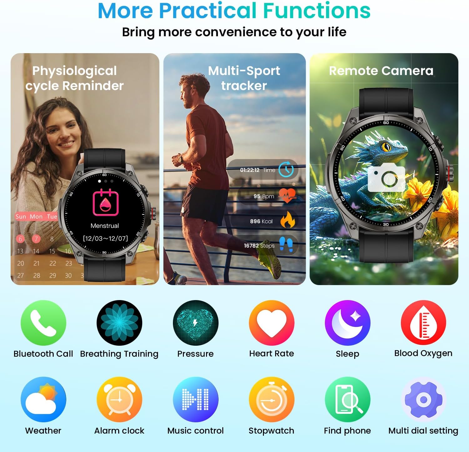 | Additional Features | Bluetooth calling ,Call Record ,Calling reminder, Call refuse, Mute caller, SMS Reminder, APP message Sleep Monitoring, Heart rate measurement, Pressure measurement, Blood Oxygen measurement, HRV Monitoring analysis, breathing training, Sedentary reminder, Menstrual cycle tracking (for women) |