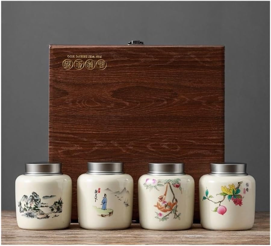 Its unique appearance and charming lines add a unique artistic touch to your kitchen. Whether as a food container or kitchen decoration, it is a reliable choice.Product name: Tea storage tankProduct material: porcelain/ceramicProduct size: see product size table for detailsCraftsmanship: handmadePacking list: tea storage tank * 1+gift box * 1,tea storage tank * 4+gift box * 1Note:Please check the size and color before purchasing.Products other than the main products shown in the main picture are for demonstration purposes only and are not included.Due to lighting, display, personal color, etc., there may be color difference between the actual product and the photo. Please refer to the actual product.The above data is for reference only. The size is measured manually. There will be an error of 0-5cm. Please refer to the actual product. Thank you.