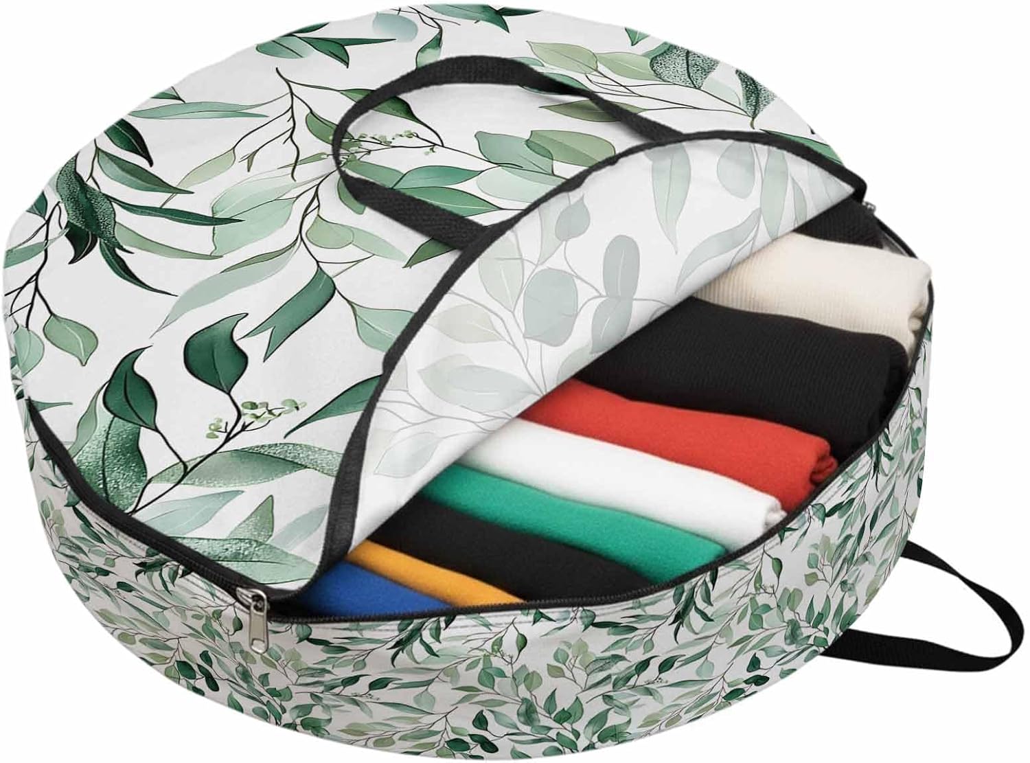 Reclaim Your Closet Space with the Round Storage Solution! Material: polyester Diameters: 24 inch, 30 inch, 36 inch Depth: 7 inches Package Includes: Round Storage Bag One Bag, Endless Possibilities: Whether you are swapping out your summer wardrobe, moving into a new dorm, or packing away holiday decorations, this bag has you covered. The circular design is uniquely suited for: Bedding: Comforters, quilts, sheet sets, and oversized pillows. Clothing: Winter coats, sweaters, and bulky ski gear. Home Decor: Holiday wreaths, garlands, and floral arrangements. Outdoor Gear: Camping blankets, sleeping bags, and beach towels. Dual Zippers: The high quality double zipper design allows the closet organizer to open wide from both sides, making it effortless to load and unload even the bulkiest comforters or wreaths. Reinforced Handles: Sturdy, reinforced handles are securely stitched to provide extra strength and a comfortable grip when carrying heavy loads or pulling the bag from under a bed. Clear Label Pocket: A transparent built-in label holder allows you to quickly identify the contents of each bag without ever having to unzip it, keeping your storage perfectly organized.