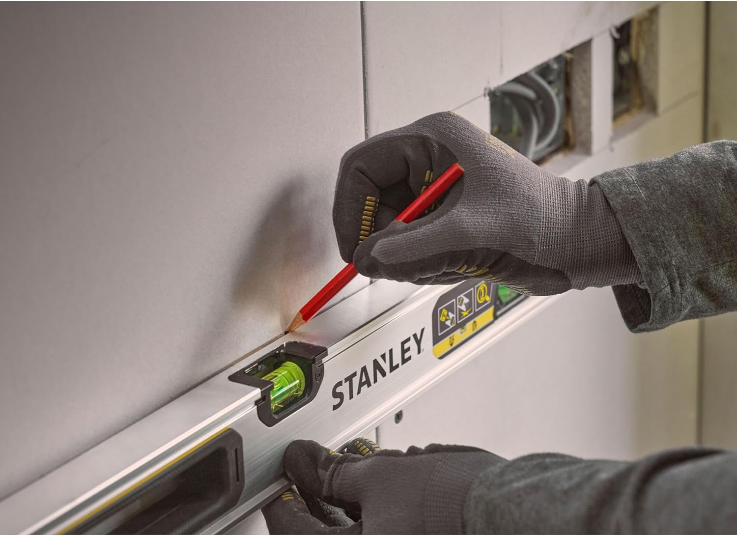 The Stanley Fatmax Xtreme hollow profile spirit levels are designed for durability and highest accuracy. They give you the performance you need for every task. The patented continuous edge allows uninterrupted lines to be drawn or tear along the entire length of the level. The finely ground main measuring edge provides an accuracy of 0.5 mm/m, the minor edge an accuracy of 0.8 mm/m. The fully protected dragonfly technology reliably protects the dragonflies from fall damage. The 90% larger bubble level ensures better visibility of the bladder. Shock-absorbing, rubberized end caps protect the spirit level in case of falls. Raised anti-slip surfaces on the end caps prevent slipping and protect delicate surfaces from scratches. The end caps are removable, making 90 degree markings and corner lines easier and more precise. Strategically placed recessed grips and all-round handles ensure comfortable one-handed operation and ergonomic handling. Magnetic versions of the spirit level are available for special applications such as drywall. They are equipped with stronger neodymium magnets than previous models. ADD TO CART NOW!