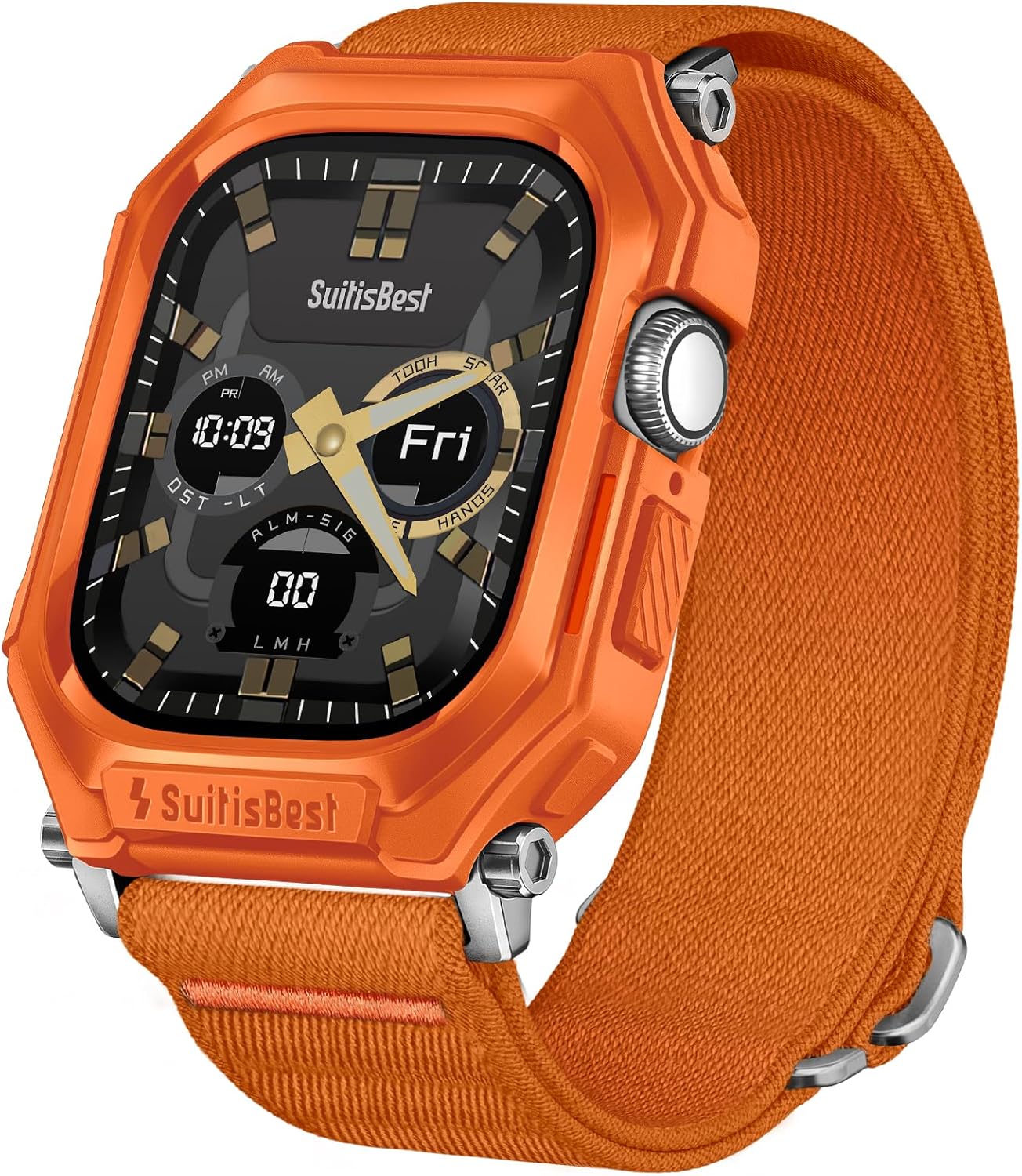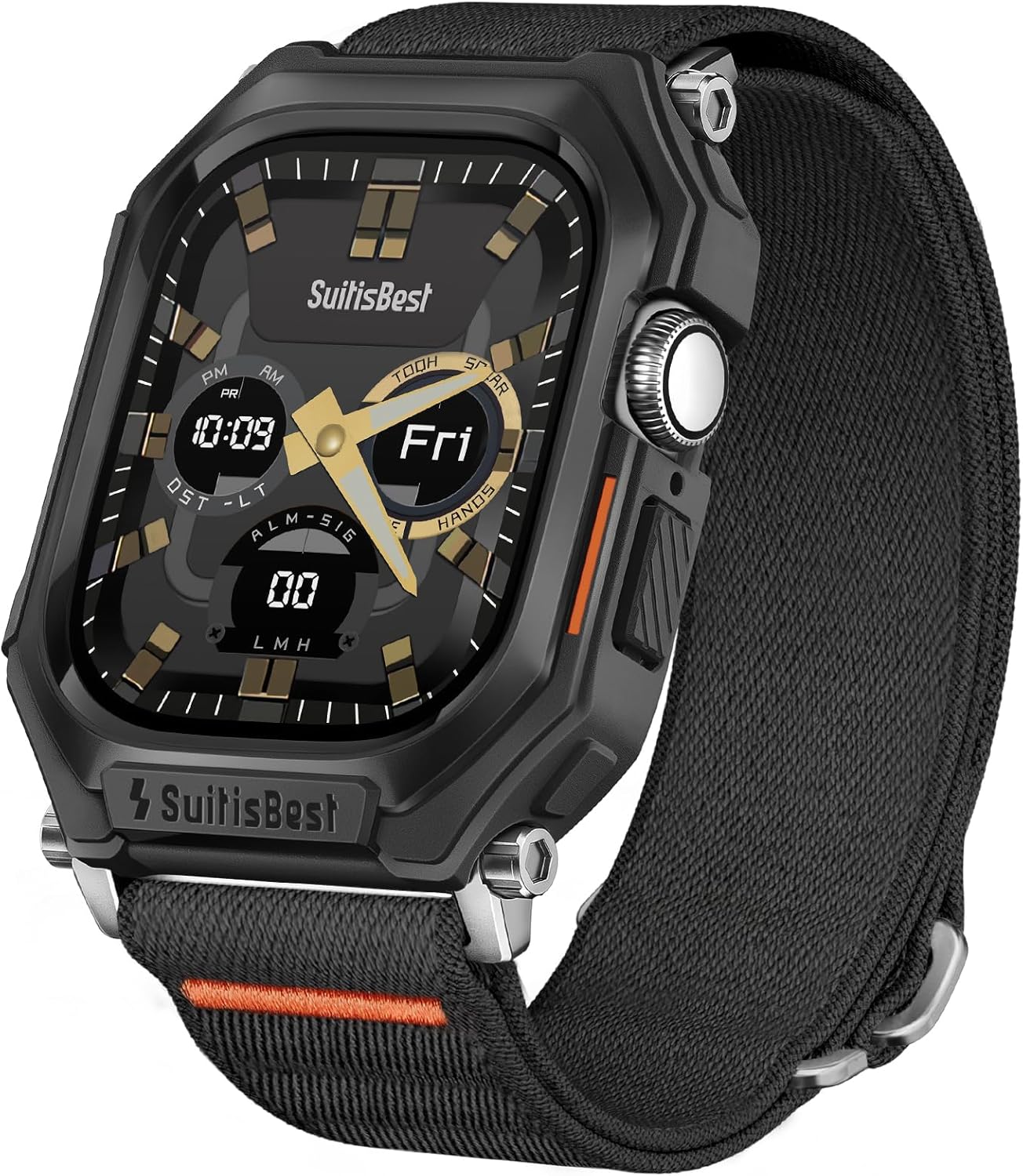 Introducing Suitisbest Apple Watch Replacement Bands and case for Men Compatible Model Apple Watch Ultra 2 Apple Watch Ultra Apple Watch Series 10 Apple Watch Series 9 Apple Watch Series 8 Apple Watch Series 7 Apple Watch Series 6 Apple Watch Series 5 Apple Watch Series 4 Apple Watch Series SE SE2 Unbeatable Durability --The Stretchy apple watch strap is made from premium nylon to ensure it's scratch-resistant, water-resistant, dirt-proof, wear-resistant, and tough enough to endure all the conditions, specially designed for running, hiking, mountaineering, swimming, camping, diving, riding, travel and more. 360°premium protection --The Apple Watch band with case provide 360°premium protection. The rugged design and durable TPU case provide full protection against daily bumps and shocks. Easy to put on and take off --Simply slide the iWatch ultra bands in and out of the apple watch. The connector is precisely cut to fit in seamlessly. Great Gift Choice --The apple watch sport strap makes a perfect gift for men, boys, friends, dad, for Christmas, Birthday, Father's Day, Thanksgiving, and Valentine's Day. Multiple Style of Fashion --The apple watch nylon band is offered in black, navy blue, deep gray, army green. The minimal yet stylish colors go well with your multi-style everyday looks from causal, sporty, business, street and active-wear.