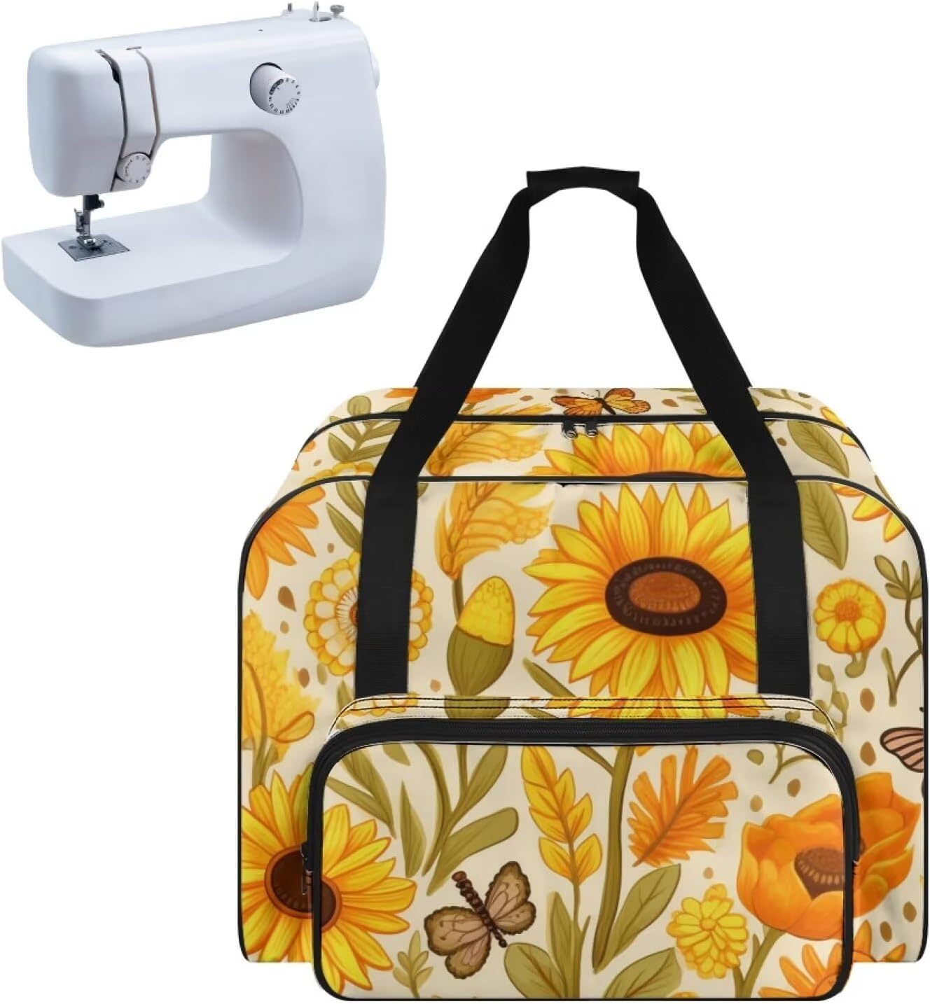 ❤Upgrade your sewing experience with our Sewing Machine Bag, designed to provide generous storage space and versatile carrying options for your sewing machine and accessories. ❤Generous Storage Space: Measuring 19.68 * 9.84 * 12.99 inches, this bag is spacious enough to store machines up to 17 x 8 x 12 inches. The main compartment fits most standard-sized sewing machines, while the unique thread spool holders and multiple custom pockets offer additional room for organizing your sewing items. ❤Versatile Front Pocket: The large front pocket is perfect for storing accessories such as sewing machine feet, power cords, bobbin cases, and other important sewing notions like scissors, spools of threads, and bobbins. This pocket provides safe and dust-free storage, protecting your items from bumps and scratches. ❤Premium Quality & Design: Crafted with heavy-duty polyester, this tote is built to last. The full zip allows for easy access to your sewing machine and accessories. ❤Travel With Your Sewing Machine: This tote bag offers a stylish and efficient way to transport your machine and tools. Whether you're heading to a class, a meet-up, or going on holiday, this bag has you covered. ❤Three Carrying Methods: With a carry handle, an adjustable shoulder strap, and a hook and loop strap closure, you have three convenient ways to carry your sewing machine bag. Plus, the beautiful floral print adds an elegant touch for the traveling sewing enthusiast.