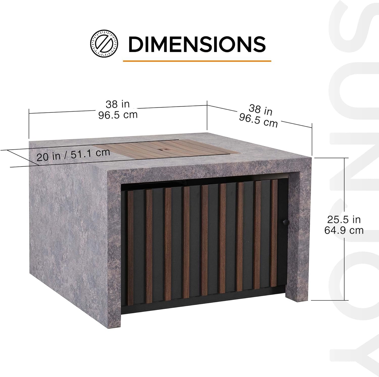 There’s nothing quite like an evening outside around a fire.Make every night at home feel special with this propane-burning outdoor fire pit table from Sunjoy, the world’s leading ready-to-assemble outdoor structure maker.- The natural stone appearing finish on a powder-coated steel frame is sure to complement any outdoor setting.- Use the provided lid to cover the center fire section for a quick conversion to a cocktail table.- Adjust the level of fire and heat with a conveniet control knob.- Conceal your propane tank (tank not included) out of the way beneath the firepit.Curl up for a cozy evening under the stars or invite friends and family over to gather around the fire.