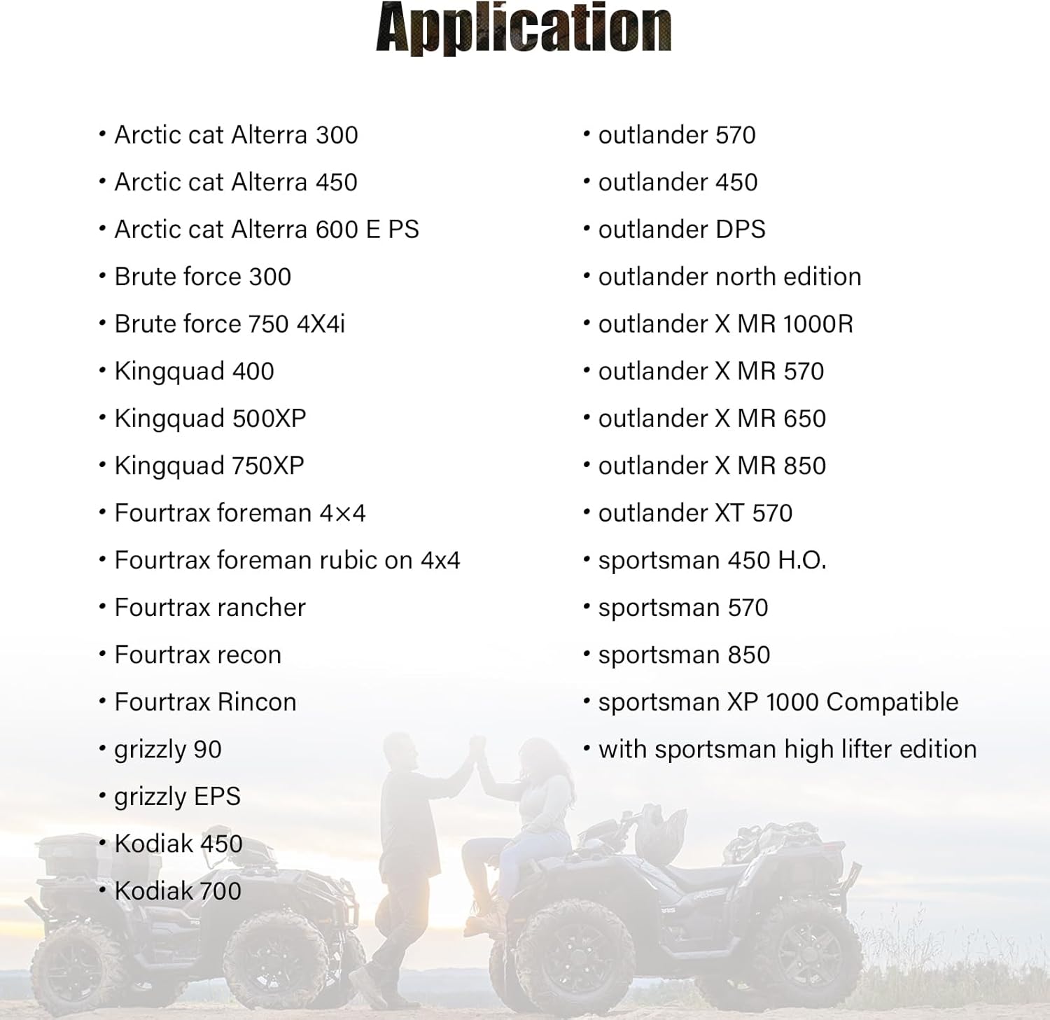 | Compatible with Vehicle Type | ATV, Compatible with Arctic cat Alterra 300, Compatible with Arctic cat Alterra 450, Compatible with Arctic cat Alterra 600 EPS, Compatible with Brute force 300, Compatible with Brute force 750 4X4i, Compatible with Kingquad 400, Compatible with Kingquad 500XP, Compatible with Kingquad 750XP, Compatible with Fourtrax Rincon, Compatible with grizzly 90, Compatible with grizzly EPS, Compatible with Kodiak 450, Compatible with Fourtrax foreman 4×4, Compatible with Fourtrax foreman rubicon 4×4, Compatible with Fourtrax rancher, Compatible with Fourtrax recon, Compatible with Kodiak 700, Compatible with outlander 570, Compatible with outlander 450, Compatible with outlander DPS, Compatible with outlander X MR 850, Compatible with outlander XT 570, Compatible with sportsman 450 H.O., Compatible with sportsman 570<, Compatible with outlander north edition, Compatible with outlander X MR 1000R, Compatible with outlander X MR 570, Compatible with outlander X MR 650, Compatible with sportsman 850, Compatible with sportsman XP 1000, Compatible with sportsman high lifter edition |